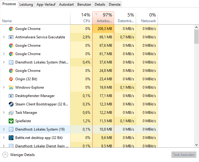 Also ich bin langsam am verzweifeln ich bin von win 7 jetzt erst auf win 10 umgestiegen. Die ersten paar tage gings gut doch nun habe ich probleme mit meinem arbeitsspeicher der angeblich zu 96%-100% ausgelastet ist und somit alles hängt vom spiel bis zum youtube video und so macht das ganze auch langsma keinen spaß mehr.
