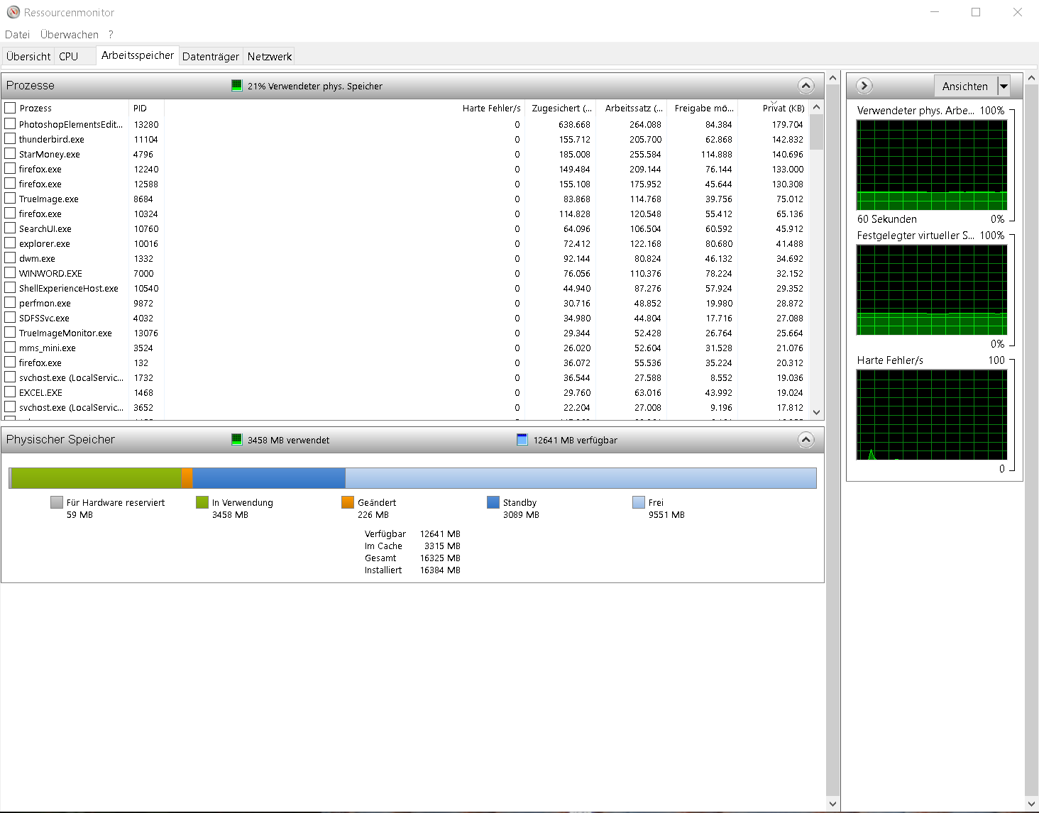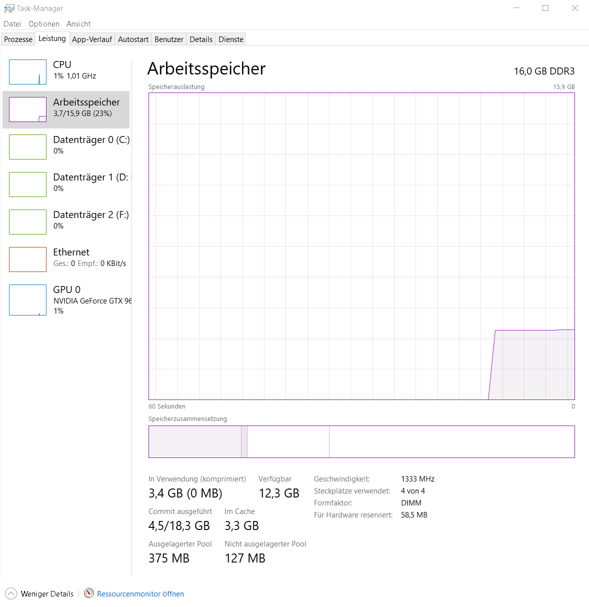 ne Frage zur Nutzung des Arbeistspeichers. Bin nur neugierig wegen der Funktionsweise. Mit welcher Software reizt Win 10 den Speicher aus? Laut Taskmanger nutzt Windows bei mir immer nur maximal 20% der verbauten 16 GB RAM aus. Selbst wenn ich diverse Tasks mit Video oder Audiobearbeitung laufen lasse und nebenbei noch im Internetz bin, zeigt mir der Taskmanager kaum mehr als 20% an. Wozu hab ich 16 GB RAM in die Kiste geschraubt, wenn Windows gerne wo anders auslagert. Ok, SSD ist als Systemplatte vorhanden, RAM ist aber noch ne Ecke schneller, als SSD, selbst auf etwas älteren Systemen.