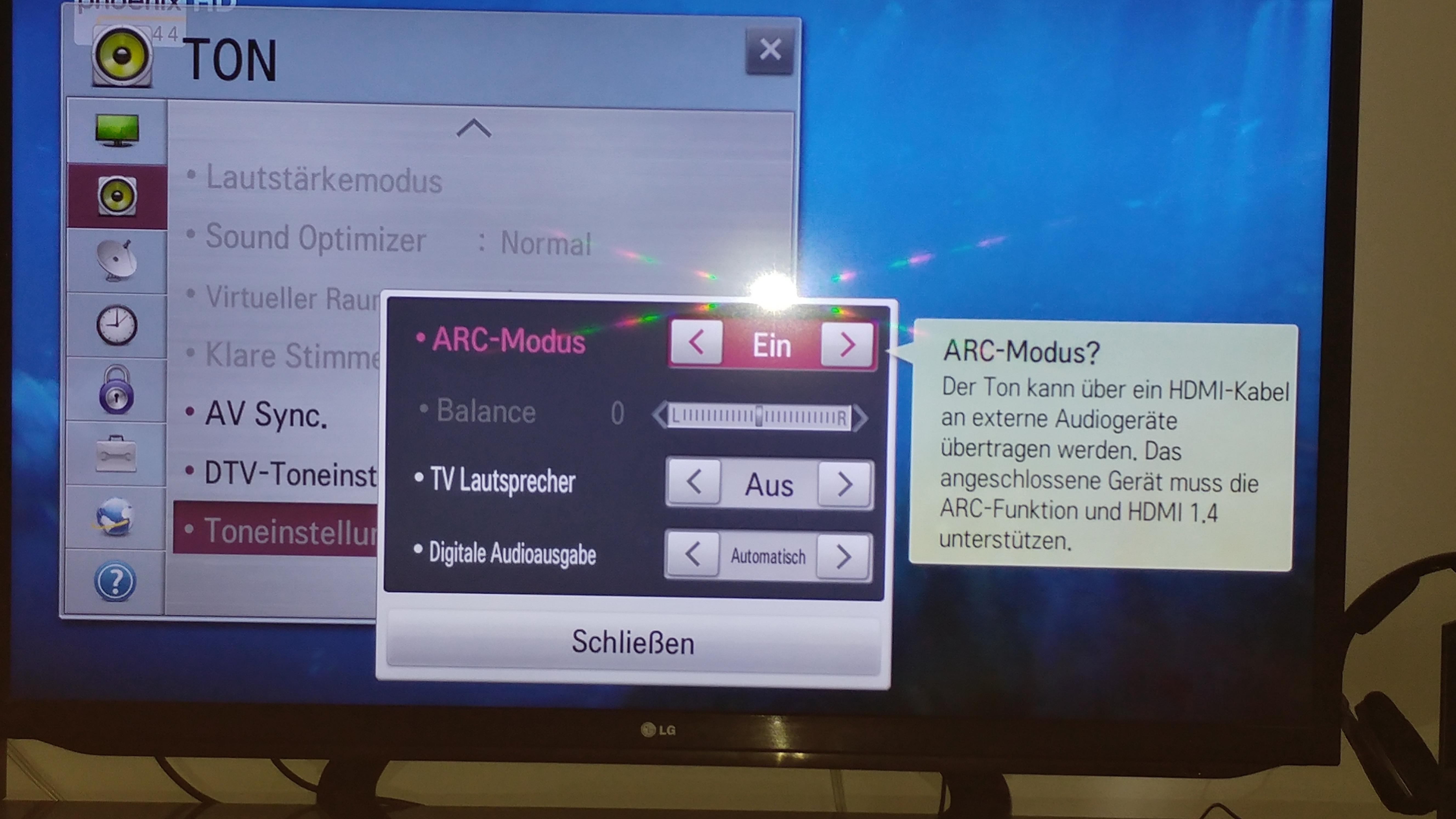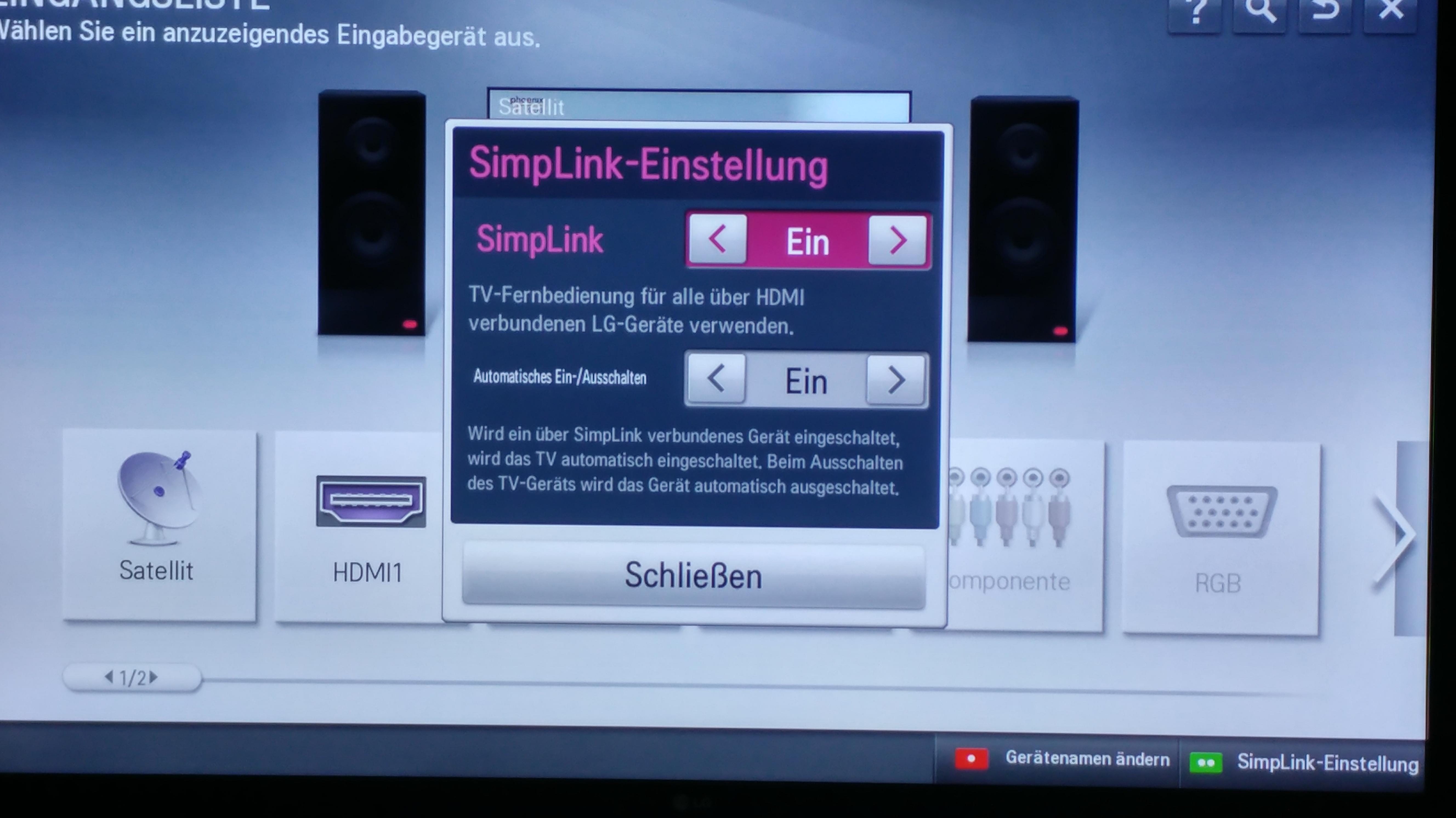 TV: Simplink aktiviert, Hdmi-Steuerung aktiviert, Tv Lautsprecher aus, Soundausgabe: extern (optisch/hdmi)