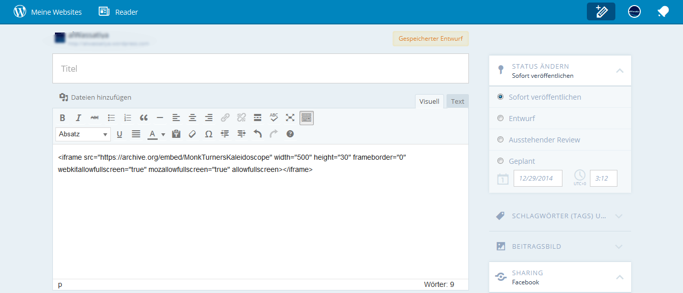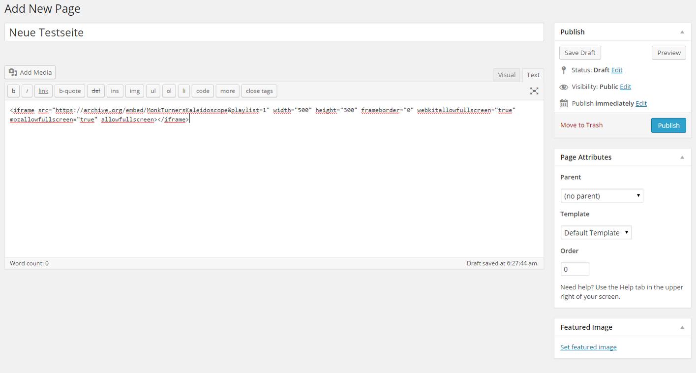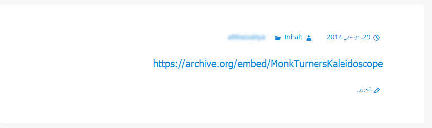 ich möchte gerne eine Playlist aus Archive.org (https://archive.org/details/MonkTurnersKaleidoscope) in meiner Wordpress Seite einfügen. Wenn ich auf oben ganz rechts auf klicke >> [https://archive.org/images/glogo2.png] >> Embed Code und dann den Code in Wordpress funktioniert es nicht.