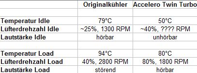 Der Stock-Kühler war mir aber auch im Idle etwas zu laut und vor allem zu unregelmäßig, da sich die Lüfterdrehzahl ständig zwischen 23% (leise) und 26% (gut hörbar) bewegte und das bei einer Temperatur von etwa 80°C. Unter Last war es dann ohnehin vorbei mit der Ruhe.
