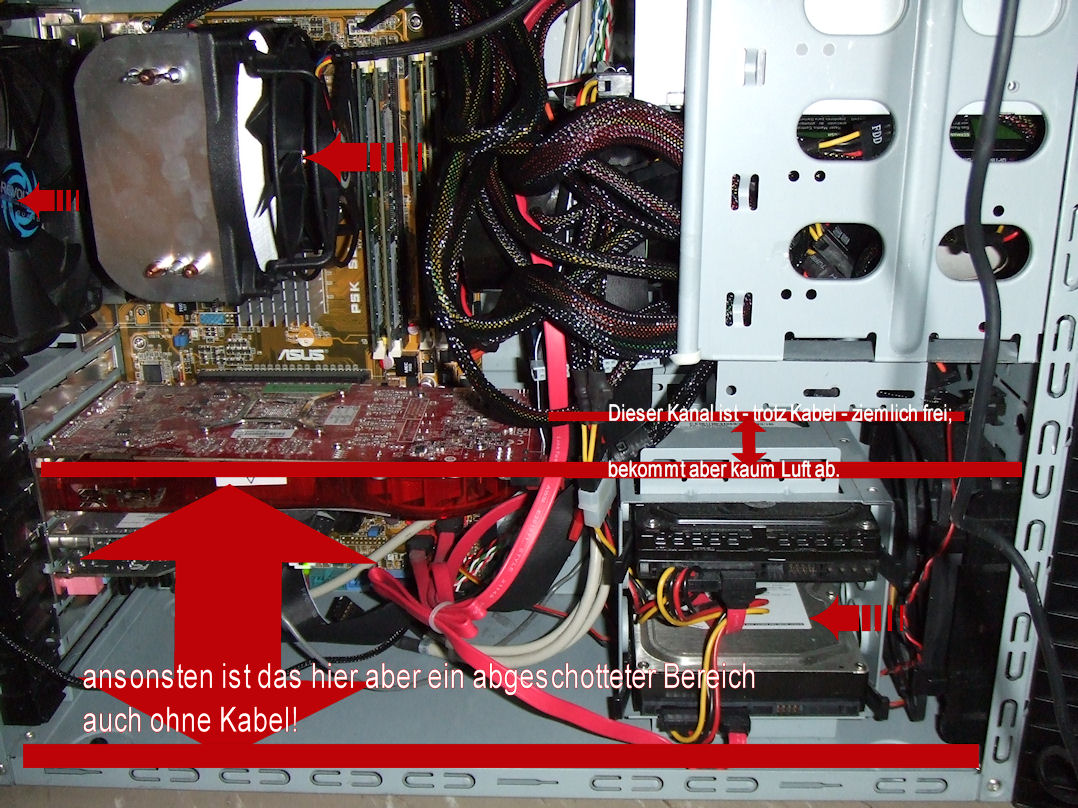 Jetzt bräuchte ich ne Wand, die den Luftstrom am Board und den HDDs vorbei bündelt; rund um den Freezer aber offen ist (das Problem ist, dass der freezer zu wenig frische Lufz kriegt; die Abluft ist dank richtig ausgerichteter Gehäuselüfter kein Problem.)