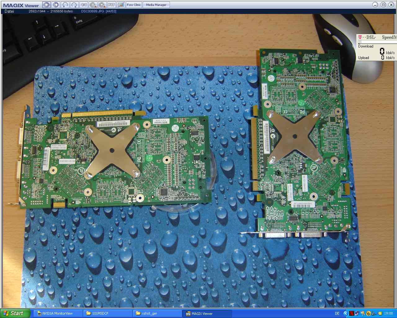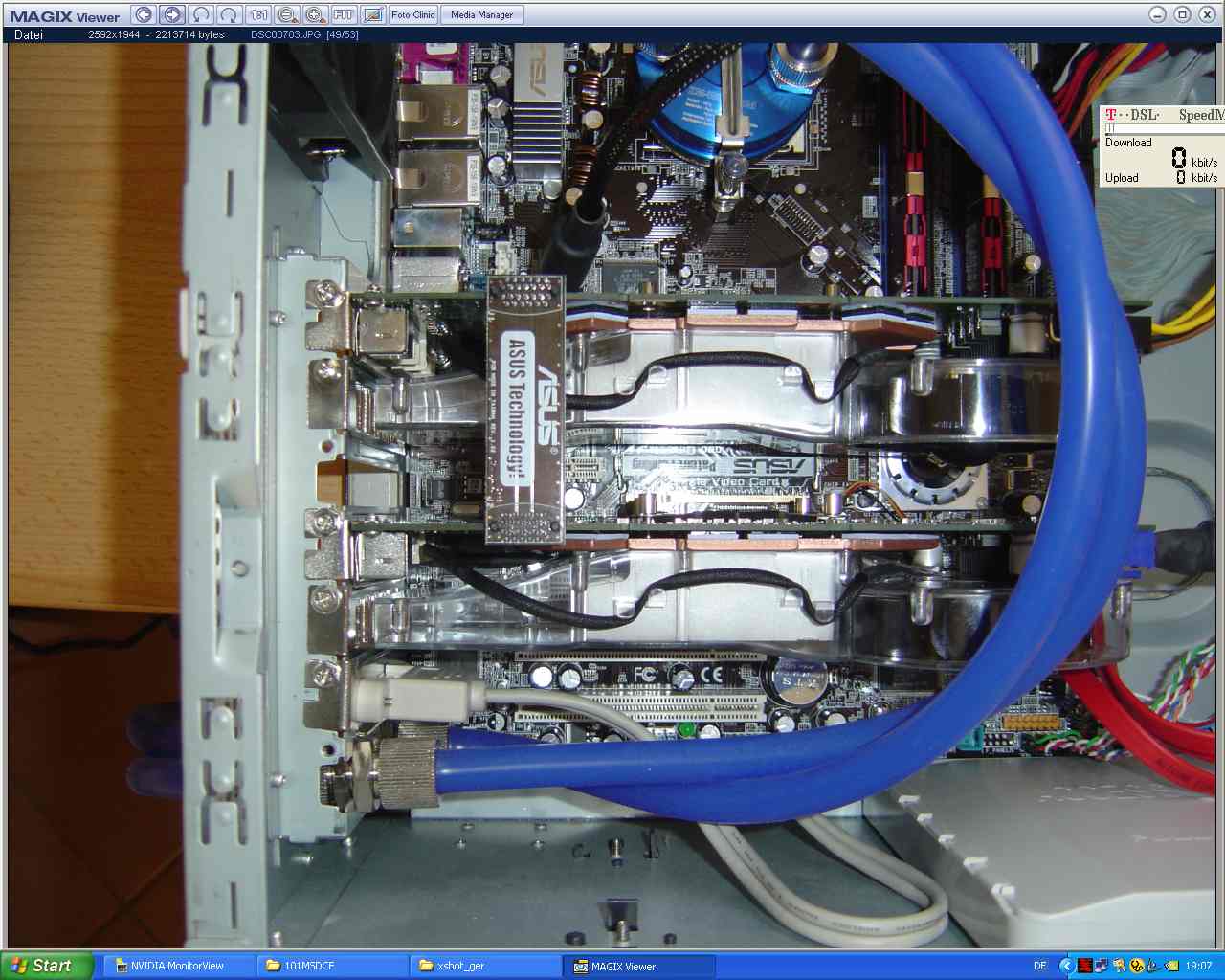 Meine Temperaturen haben sich unter Windows auf 57/48 Grad eingependelt. Und unter Last komm ich auf 70/67 Grad. Die Obere Karte wird noch relativ warm, weil der Lüfter genau vor dem Chipsatzlüfter liegt-somit wird schon warme Luft angesaugt. Für dieses Problem brauch ich noch eine Lösung. Wenn ich nur eine Karte laufen lasse hat die eine Temperatur von 47 Grad unter Last war es maximal 68 Grad. Ich denke die Temperaturen sind für 6800GTs ganz OK. Vorher waren die Temps bei 58/55 Windows und 83/72 Last--also etwa 10 Grad besser unter Last.