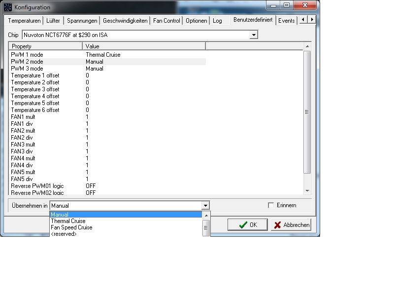 Das lustige ist auch, SpeedFan zeigt mir gar nicht alle Optionen für die Lüfterregelung. So fehlen z.B. "software controlled" und ich hab auch keinen "PWMCLOCK out"oder sonstwas.