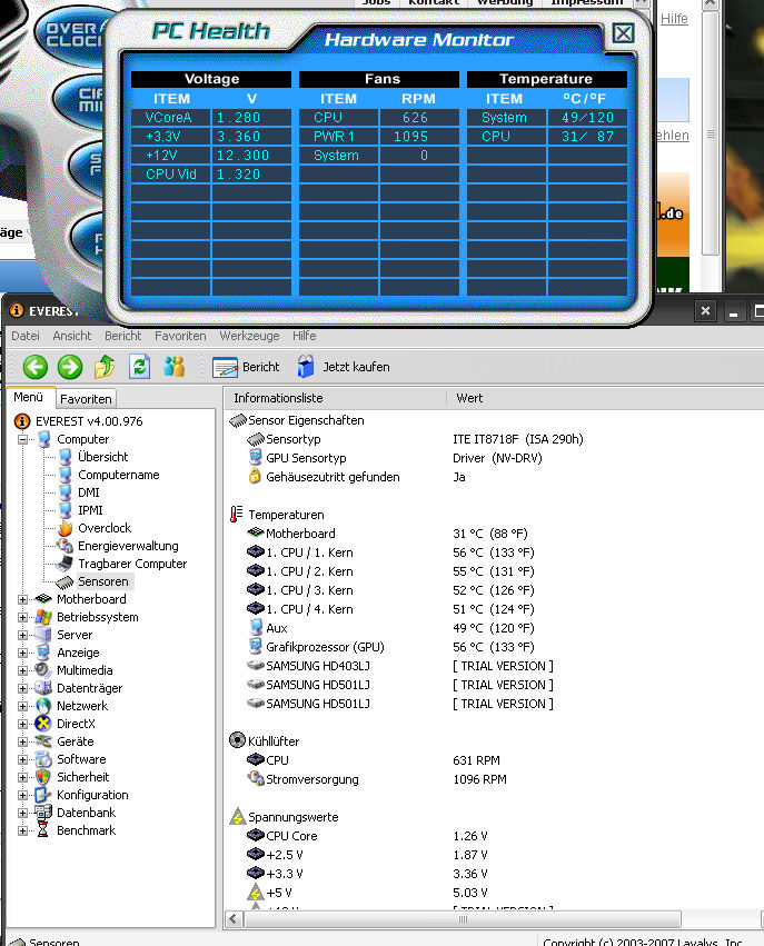 Hier ein Bild von den Temps, allerdings bezeichnet Everest wohl fälschlicherweise die CPU Temp als Motherboard Temp: