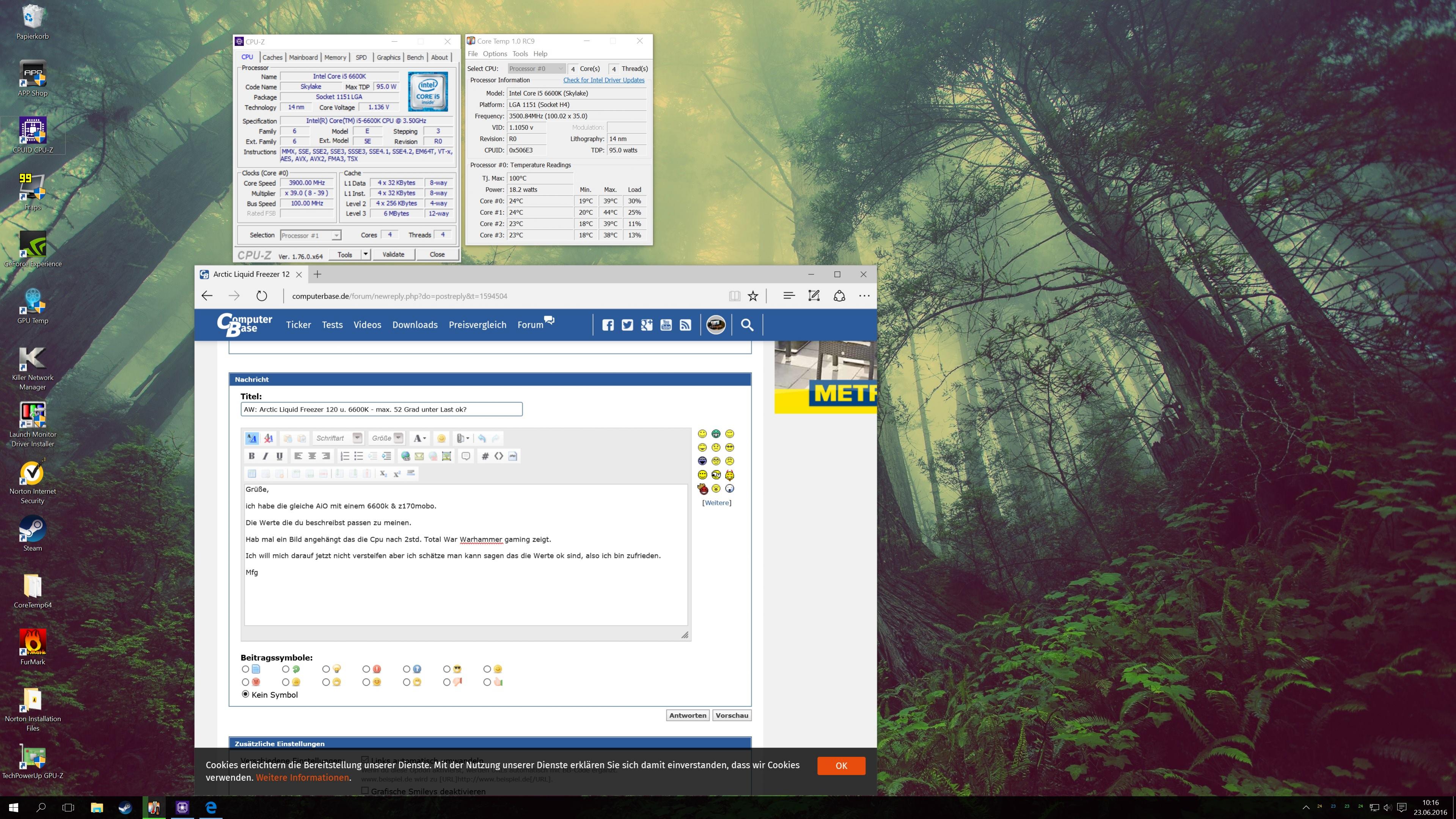 Ich habe trotz H110 Chipsatz versucht die i5-6600K CPU zu verbauen und in meinem doch wirklich engen Gehäuse diese mit dem Arctic Liquid Freezer 120mm auszustatten. Dieser ist nun oberhalb am Gehäuse (mittig) installiert und bläst die Luft nach außen.