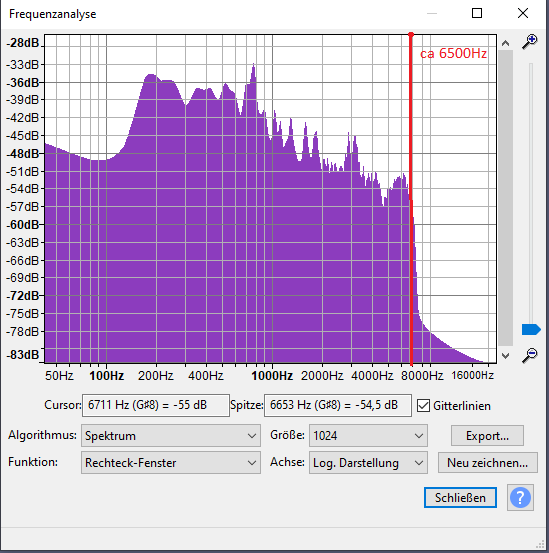 Ich habe den Sample mal runtergeladen, in Audacity importiert und dort zeigt sich tatsächlich der von Steelseries angegebene Frequenzschnitt bei ca. 6500Hz