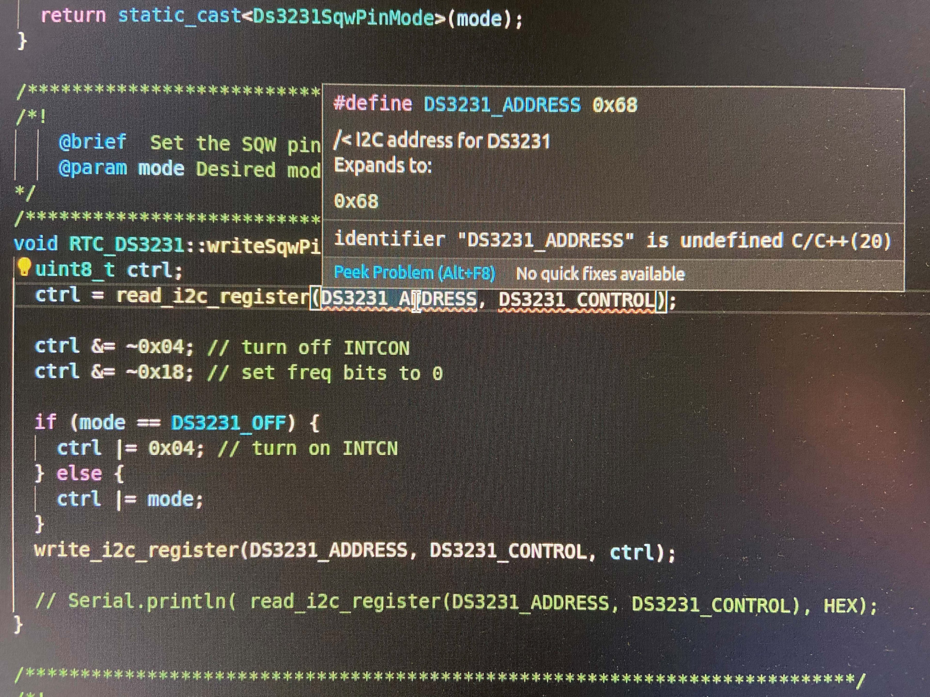 ich habe ein Problem mit dem Intellisense von Visual Studio Code und dem Arduino Plugin. Ich habe eine normale Zip-Library (RTClib) in der IDE importiert (landet dann ja unter ~/Arduino/libraries/). Die entsprechenden Pfade habe ich auch in der c_cpp_properties.json eingetragen. Ich bekomme nun aber dutzende von Fehlermeldungen in der RTClib.cpp, für die defines die in der RTClib.h definiert sind. Über rechtsclick -> "go to Definition" komme ich jedoch in den header, dieser wird also gefunden (siehe Bild). Ich habe also keine Ahnung was der Quatsch mit den Fehlern soll. Der Code compiliert auch (sowohl Arduino IDE als auch VSCode) und läuft. Es handelt sich also "nur" um ein Problem mit dem Intellisense. Der C_Cpp.intelliSenseEngine Tag Parser "löst" das Problem, aber dann ist das Autocomplete vollkommen für die Tonne, da einfach alles angezeigt wird, und dann kann ich gleich mit der Arduino IDE weiterentwickeln...