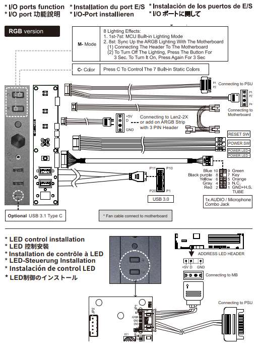 Am Gehäuse ist im I/O Panel ein RGB-Mode-Switch. Von dem weg geht ein Y-Kable, um die drei Lüfter die vorinstalliert sind anschliessen zu können.
