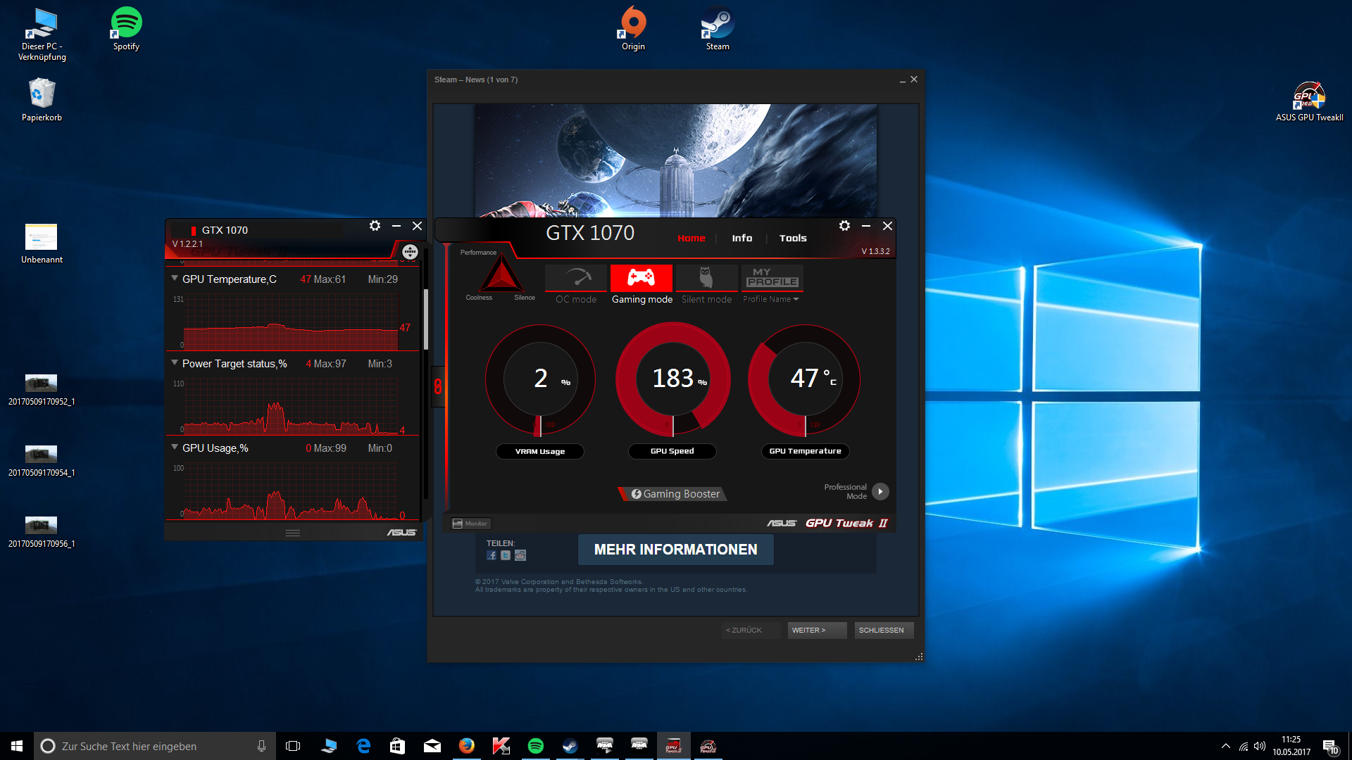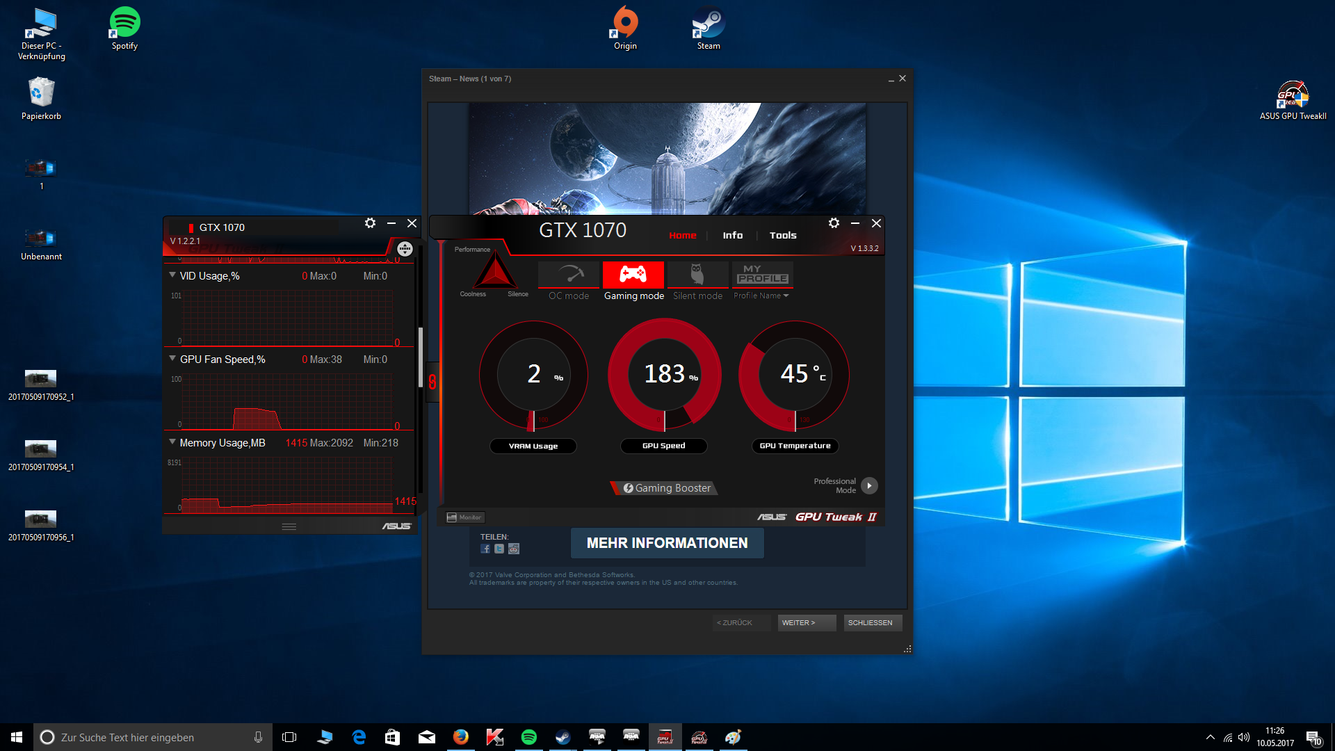 Man sieht auf den Screens dass Deine GPU sich langweilt, was zu erwarten war bei einem CPU-Limit. Allerdings sind 700Mhz für eine 1070 auch nicht gerade der Weisheit letzter Schluss. Läuft aber auch kein Game nebenher? Also wie Aussagekräftig sind die Screens?