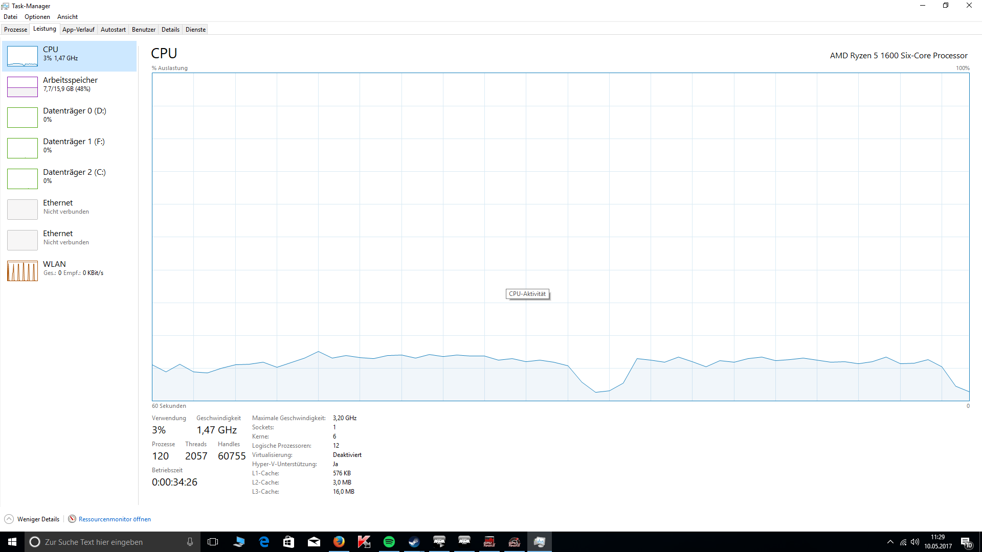 Möglichkeit 2: AMD Ryzen 1600 kann ausgeschlossen werden, auf dem Server waren Leute die ihn ebenfalls Nutzen. Zudem wäre es schlicht nicht zu erklären, warum ein neue PCU, selbst wenn sie erst seit einem Monat auf dem Markt ist, ein dermaßen schlechte Performance liefert. Es gibt bereits Tests, da läuft auch meine CPU bei aktuellen Spielen auf Ultra Einstellungen mit 70-80fps.
