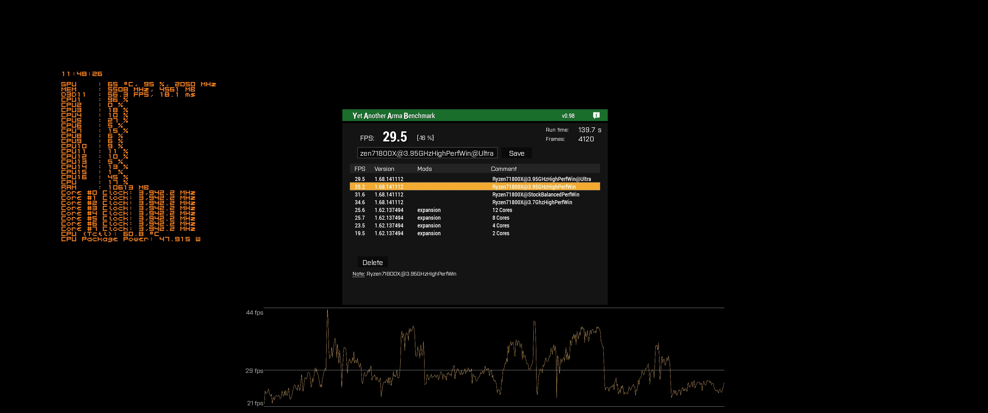 Wenn Du @3.95GHz 29.5 FPS @ Ultra hinbekommst und ich mit 3.8GHz 36 FPS mit den gleichen Settings, dann wissen wir ja jetzt das schneller Speicher bei Ryzen genauso viel bringt wie unter Core was ArmA3 angeht. Das sind immerhin >20% mehr FPS bei niedrigerem Takt.