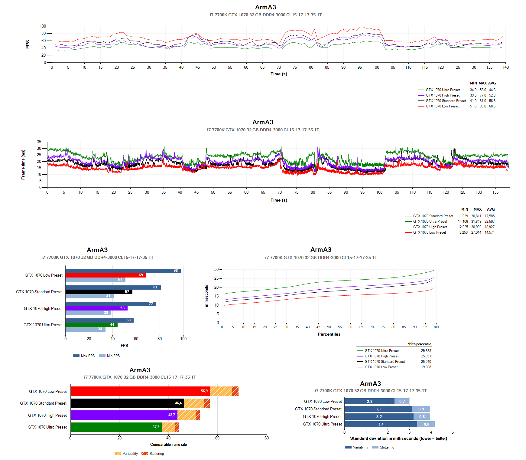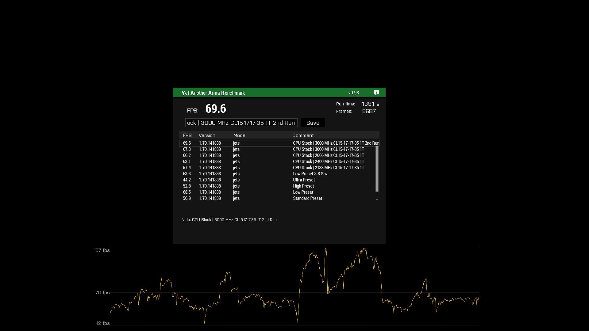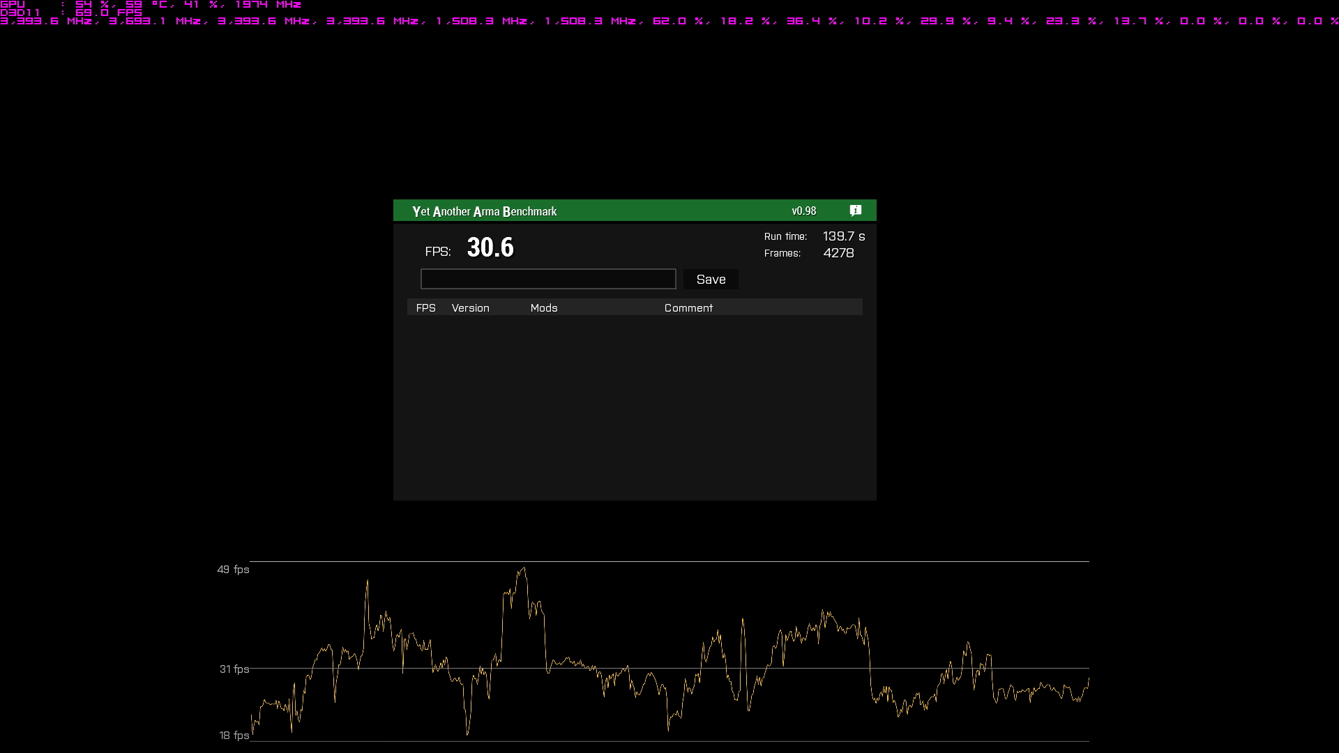Da ich aber @Low schon höhere Ergebnisse hatte, vermute ich dass hier die GPU nicht mehr voll getaktet hat oder der Benchmark ein klein wenig anders ablief. Selbst wenn gescriptet, Kleinigkeiten sind immer was anders. Fahrzeuge fahren anders, der Heli nimmt manchmal Raketen, das Auto geht in Flammen auf und manchmal nicht.. Hatte daher eben nochmal einen zweiten Run gemacht mit 3000 Mhz und das Ergebnis war was höher.