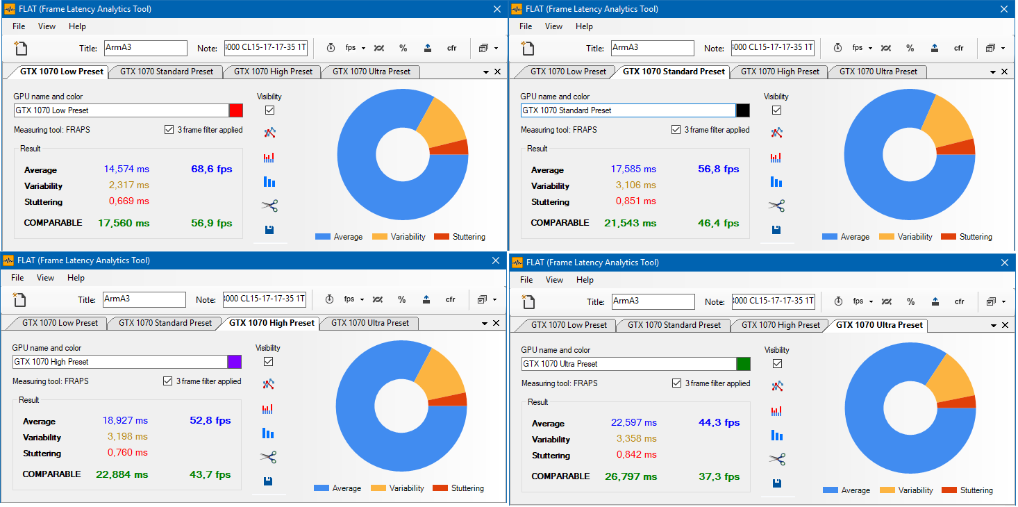 "FLAT ( Frame Latency Analytics Tool ) is a simple application designed to analyze the time frames that are generated by the GPU when rendering images in computer games. FLAT adds support for processing and display multiple measurements in a single user interface (maximum 5)."