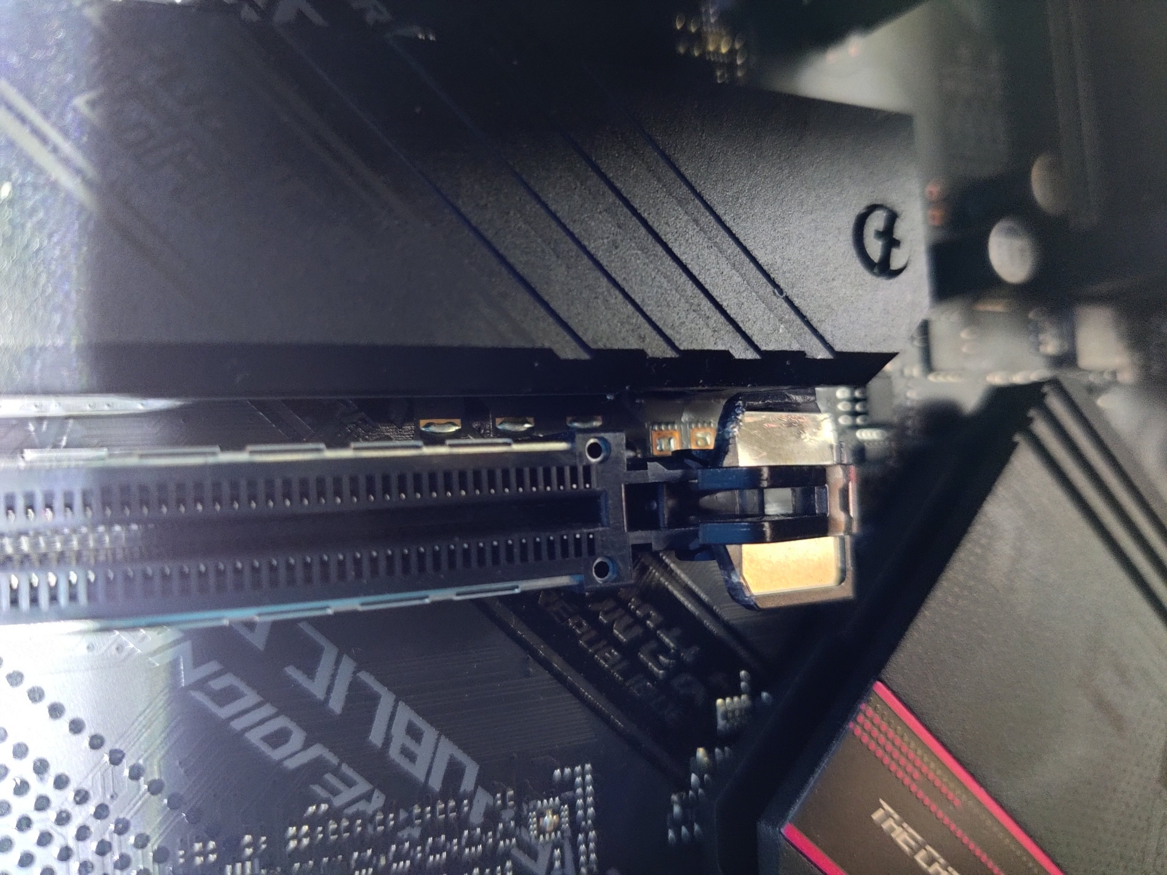 Jeder Tausch der Grafikkarte wird mit diesem Bauteil zu einer Qual. Mein vorheriges AsRock hatte einen "Schieber" zur Seite, das war total easy. Mit dieser Klammer bei ASUS, musst du aufpassen, mit einem Plastikkeil keinen Kratzer auf das Board zu setzen. Von unten kommt man nicht ran, also muss die Arretierung von oben gelöst werden,.