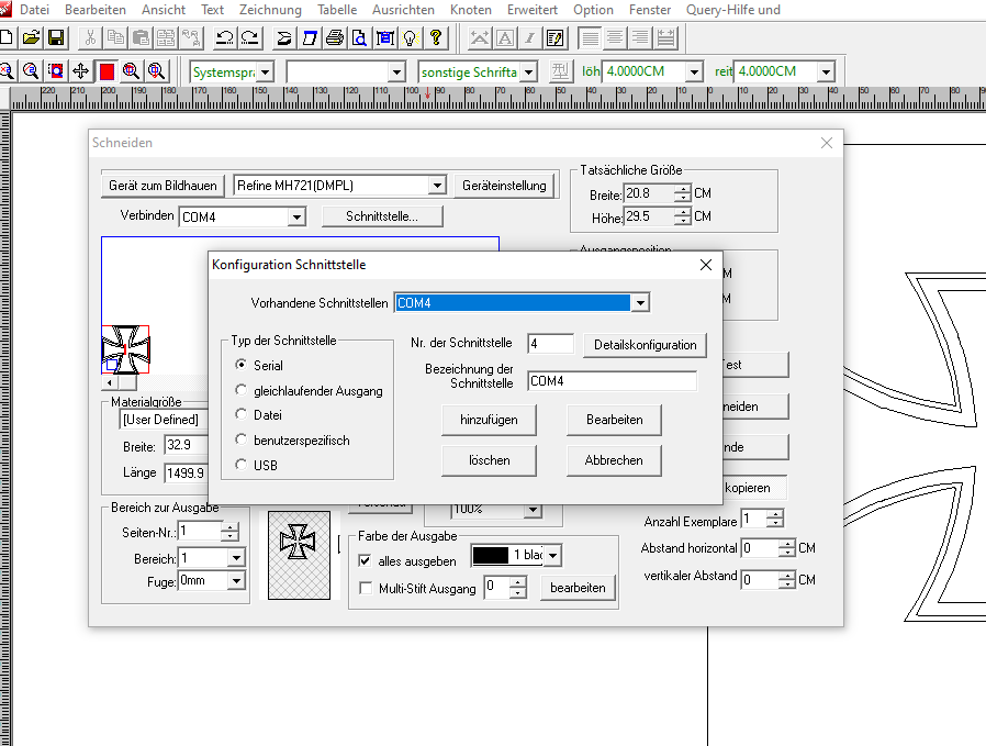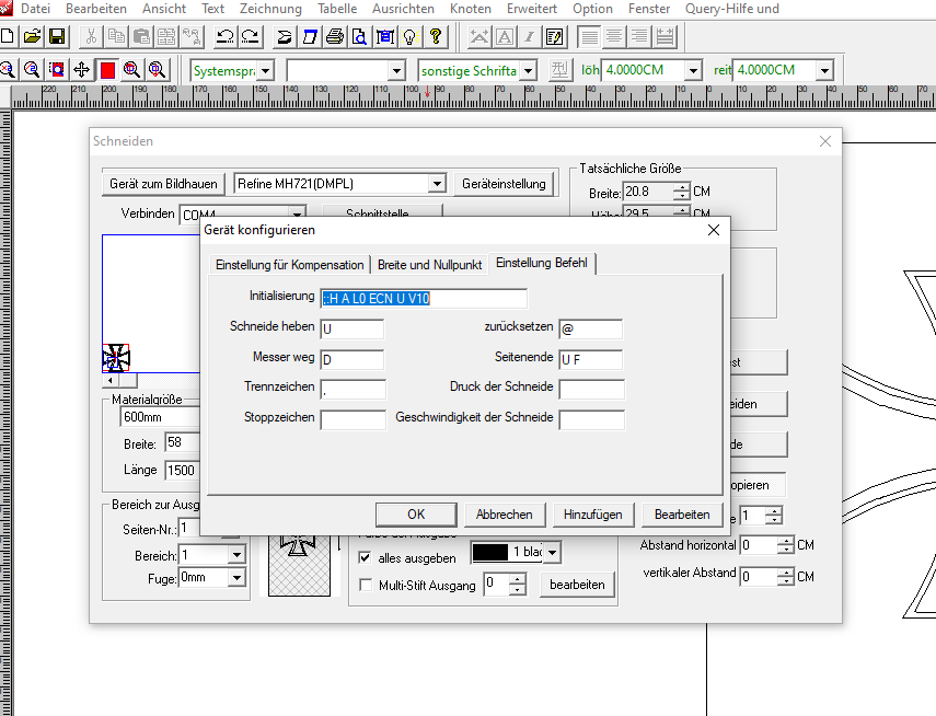 Nun bin ich - gemäß der ArtCut-Bedienungsanleitung - vorgegangen, habe mir über den Befehl plotten das neue Plotterfenster geöffnet, dort über den entsprechenden Plotter den Refine MH/21 DMPL ausgewählt, diesen installiert (Bitrate usw. gemäß Anleitung).