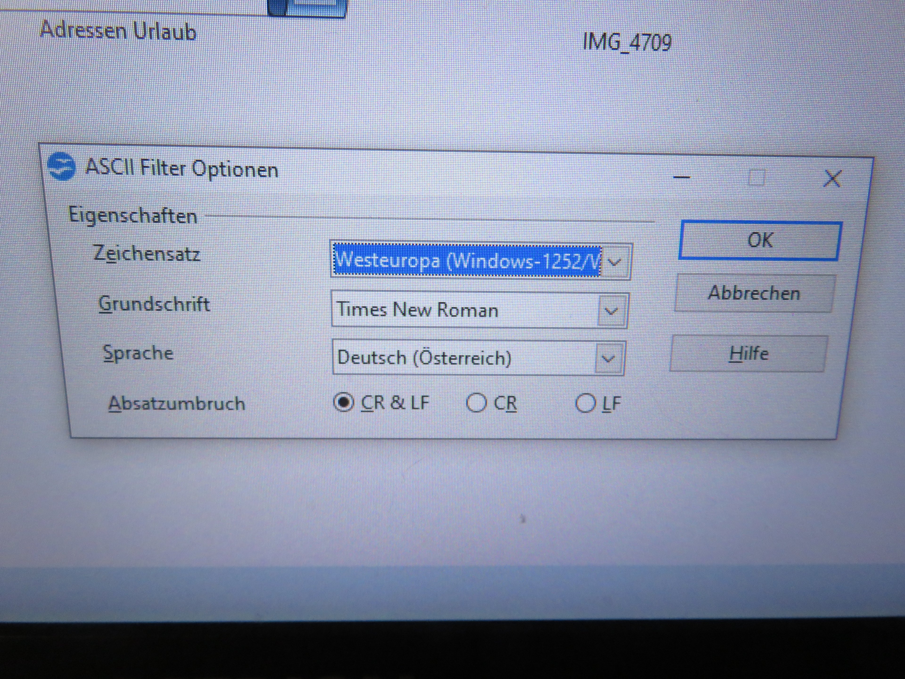 Beim Öffnen von Dateien kommt oft (nicht immer) ein Fenster "ASCII Filter Optionen" mit "Zeichensatz", "Grundschrift", "Sprache" (eh alles richtig voreingestellt), CR, LF, Drückt man OK erscheint nicht das gewünschte Dokument, sondern ein paar sinnlose Zeilen mit Groß-und Kleinbuchstaben. Ich habe also wichtige Dokus schon gelöscht und z.T. neu getippt., wenn ich sie nachvollziehen konnte. Unnötige Arbeit. Vieles ist aber verschwunden.