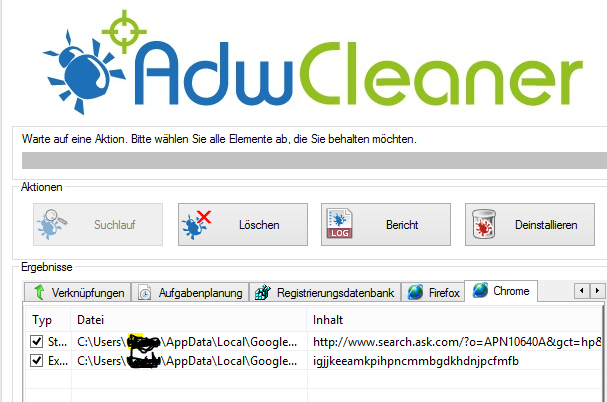 Hey Leute, vor kurzem habe ich mit dem Adwcleaner einmal meinen Pc gescannt und dann wurde mir angezeigt, dass ich Ask Search installiert habe (und noch eine andere Datei, siehe Bild) und auch in Chrome wurde mir unter Einstellungen gezeigt, dass meine Einstellungen von einem anderen Programm manipuliert worden sind und Chrome diese auf den Standard zurückgesetzt hat. Nun habe ich also Ask löschen lassen, dennoch war nach dem Neustart von meinem Pc und nach dem Öffnen von Chrome das besagte Programm und das dazugehörige wieder da. Auch wenn ich es im Ordner von alleine gelöscht habe, kam es immer wieder. Mich hat das sehr genervt, dass das nicht weggehen wollte und deswegen habe ich mich entschlossen meinen Pc neu aufzusetzen (meine wichtigen Daten hatte ich ja eh auf meiner Externen...). Nachdem ich wieder alles neu eingerichtet habe, hab ich wiedermals einen Scan gemacht und ich hatte dieses Ask-Programm wieder auf dem Pc. Mittlerweile habe ich keine Ahnung mehr was ich machen könnte. Weder unter Programmen noch unter den Einstellungen im Browser wird das gelistet.