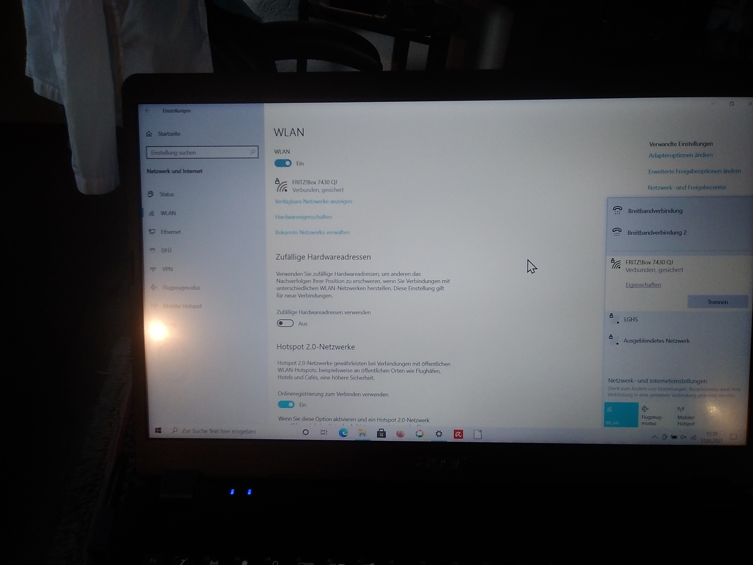 Obwohl ich wie immer mein Laptop einschalte, er mir sagt: mit Fritz Box verbunden, gesichert. Das Symbol für WLAN ist zu sehen.