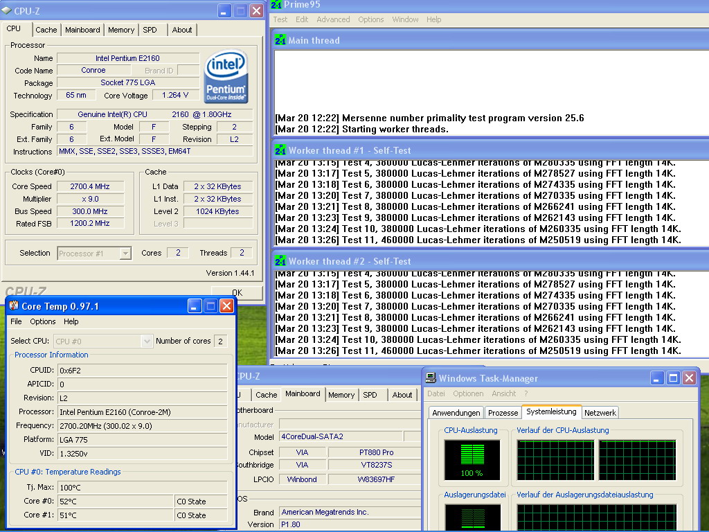 Edit: hab noch etwas experimentiert und 298 beim FSB eingestellt. Damit startet Windows sauber und prime95 läuft stabil. Komischerweise läuft der FSB jetzt aber konstant mit 300Mhz, somit die Cpu mit 2700Mhz. Die Temps sind sogar noch niedriger als mit dem FSb von 295. Wenn ich das so lasse, laufe ich Gefahr, dass mir demnächst das Board abraucht?