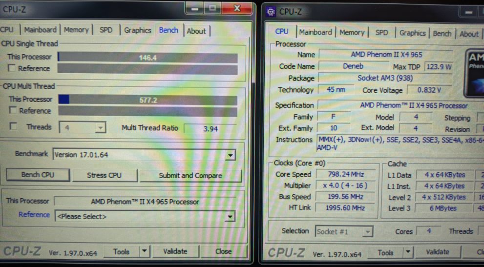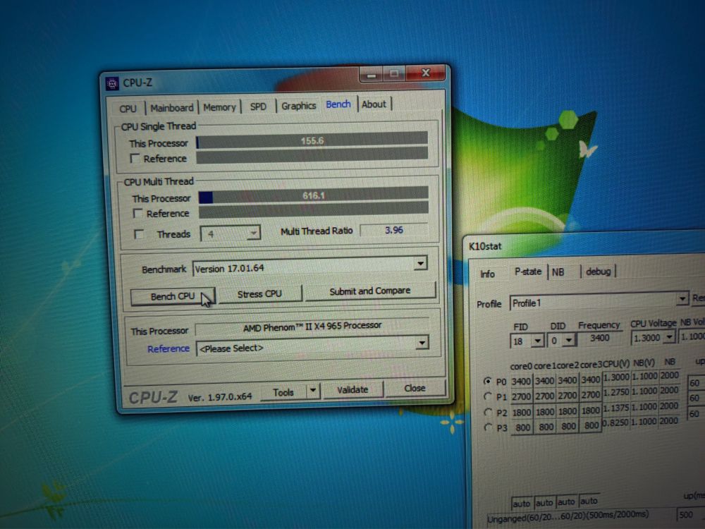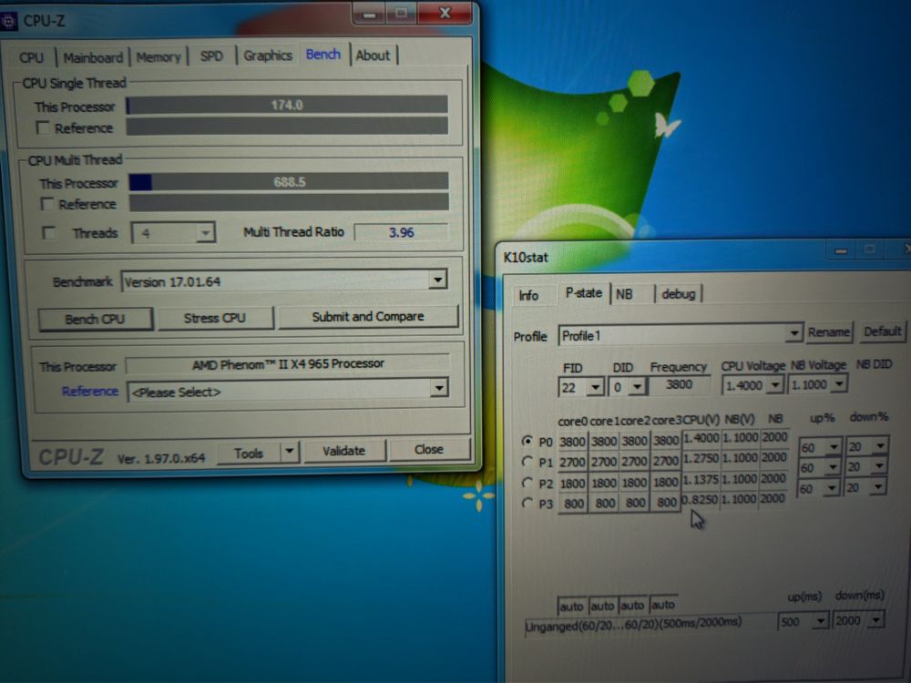 Den 965BE hätte ich als 955BE mit 3.2Ghz testen müssen. Also noch weniger FEAR FPS. Bei den niedrigeren Bildraten wird die GPU nicht besser mit Daten gefüttert, wodurch die Last noch stärker zwischen 170-200W pendelt. K10Stat auf