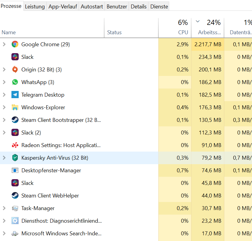Mein Problem: wenn Windows 10 startet und der Desktop zu sehen ist , also kein einziges Programm offen ist, dann sind bereits 7 GB RAM belegt. Ein Neustart oder auch Herunterfahren hilft nicht. Fast Boot ist deaktiviert.