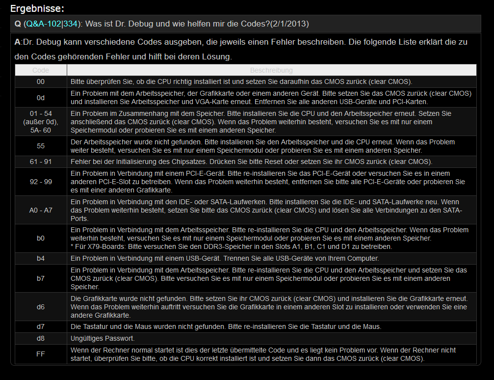 Bios Reset gemacht, sowohl per Batterie, als auch per Jumper. Grafikkarte entnohmen und per Onboard laufen lassen. Eine andere Grafikkarte getestet. Jedoch alle erfolgslos.