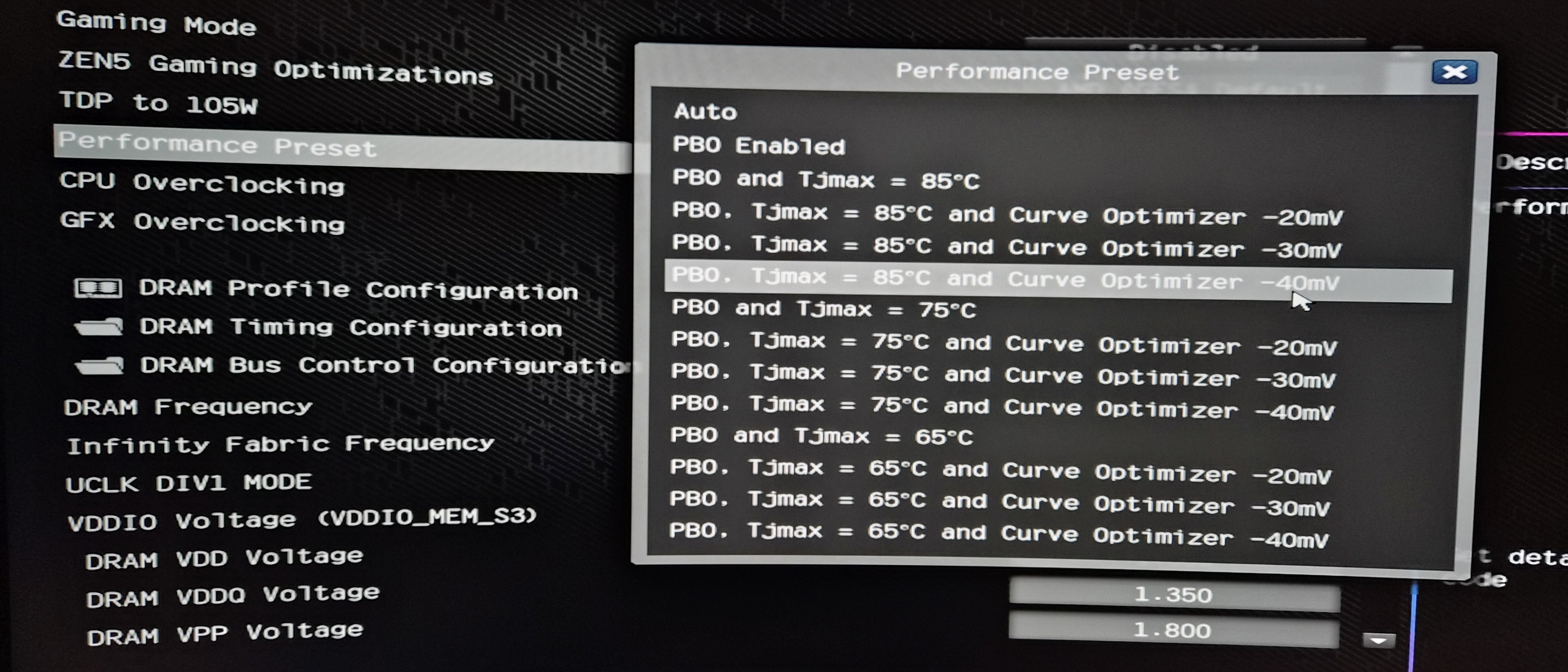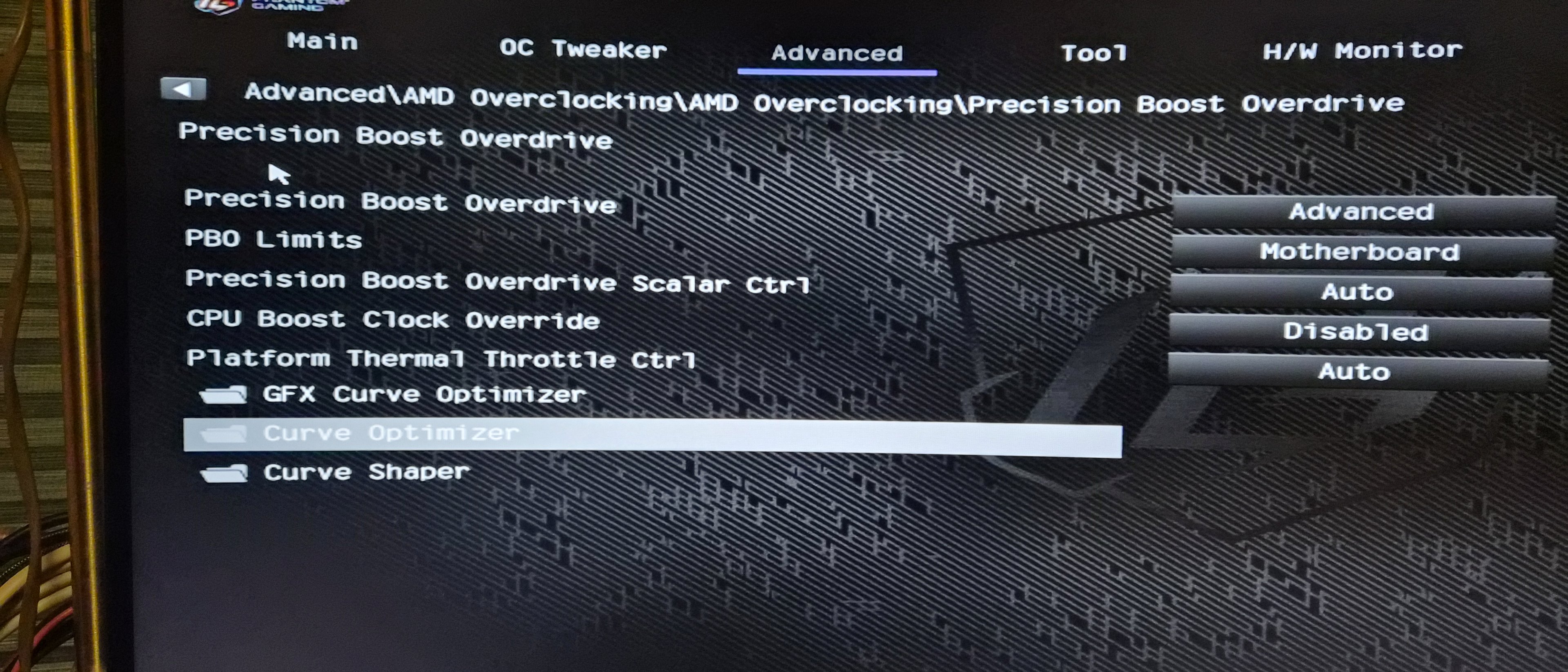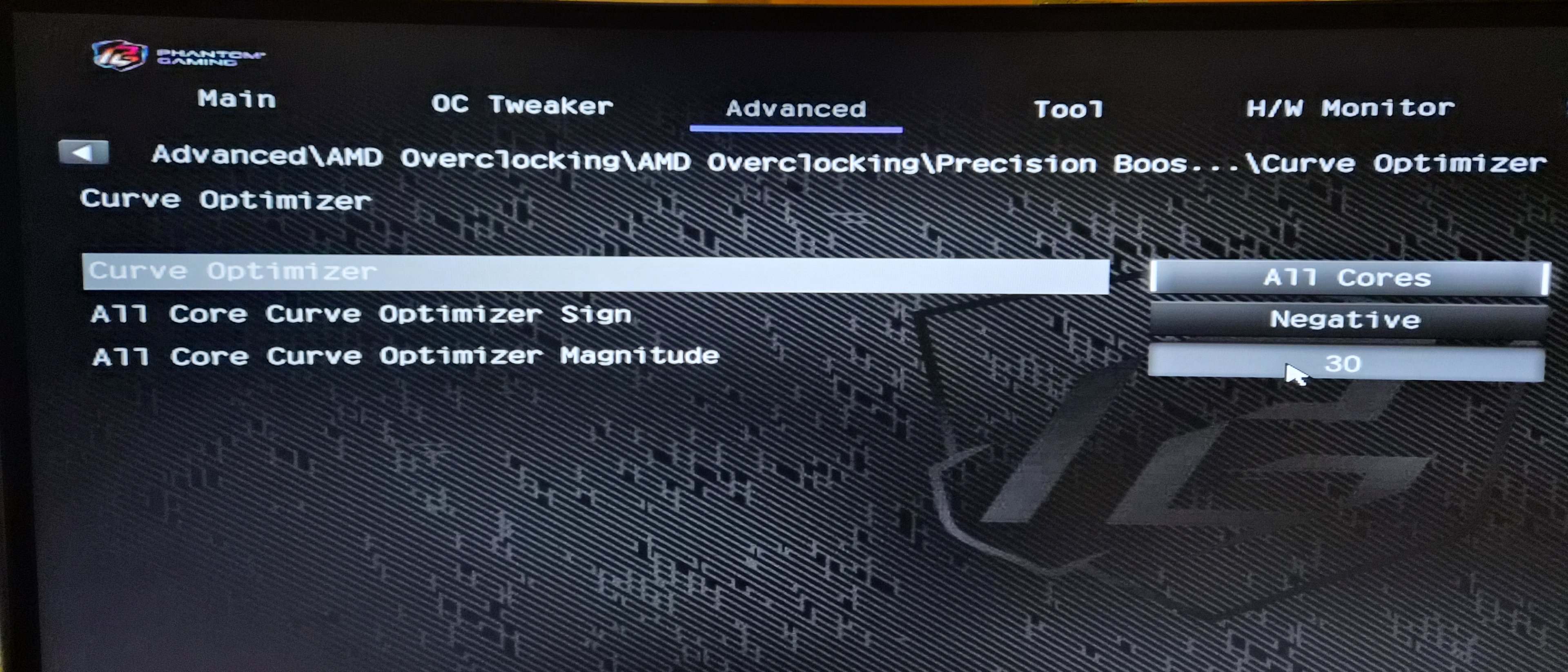 Dann versuchte ich im Bios unter Overclocking dort das undervolting mit dem curve-optimizer auf negative 20 oder 30 zu setzen....