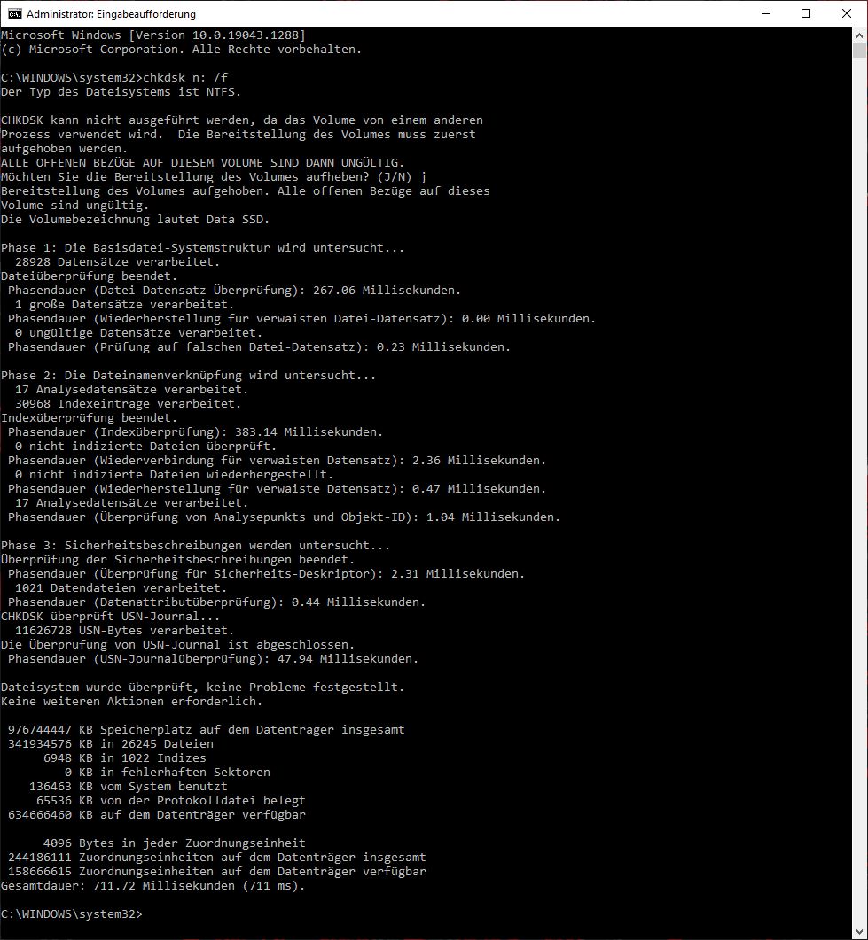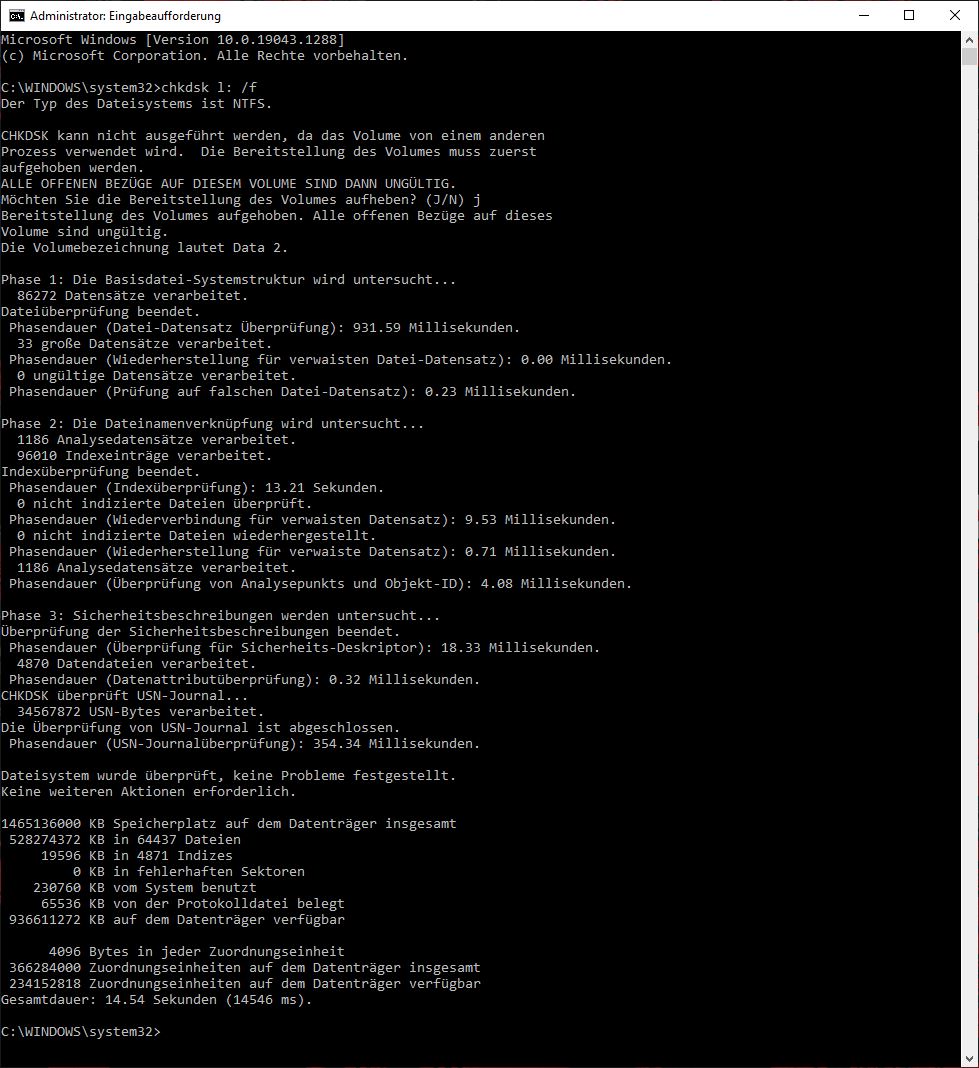 Danach alle Laufwerke mir Chkdsk /f laufen lassen, wobei ich dan nur bei zweien (nicht Systemlaufwerke) ein Ergebnis bekomme: