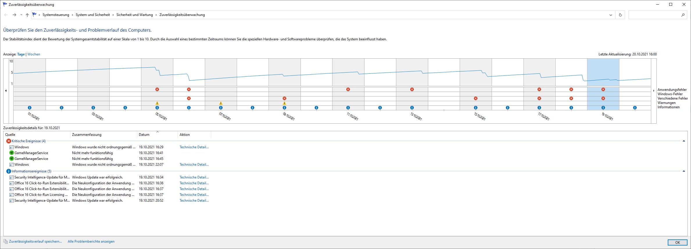 Beim Zuverlässigkeitsverlauf hast du ja Datum und Zeitangabe wann was passiert ist, mit den Daten und der Bezeichnung der Software kann man in der Ereignisanzeige weiter Daten suchen. Da gibt es dann vielleicht eine Fehler Nummer mit der sich was anfangen lässt.