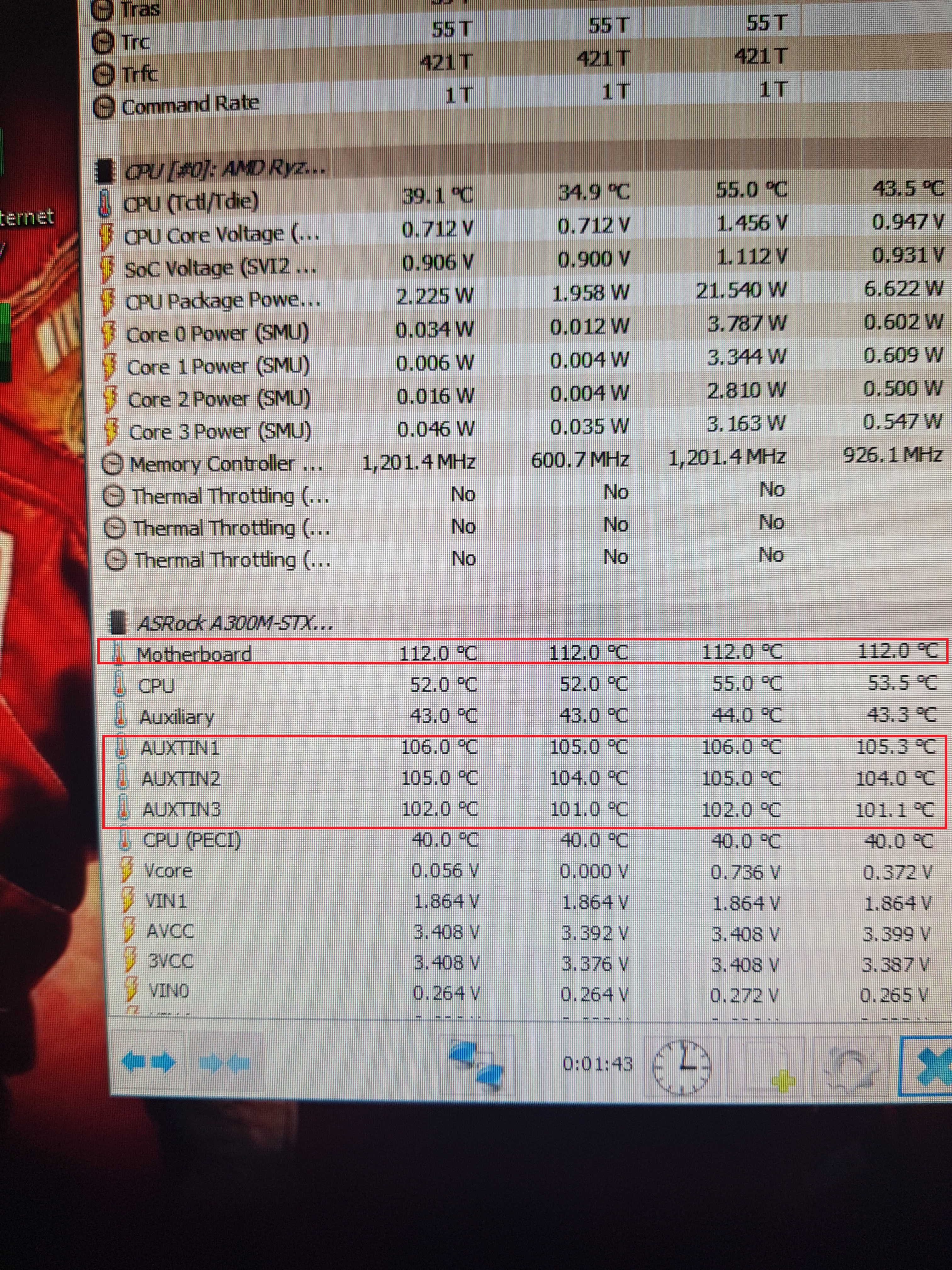 Mopped bei mir hinstellen. Zusammenbau war im Nu erledigt, das Teil ist flott wie sonst was (3400G, 2x 8Gb, Samsung 970 Evo [Budget war kein Hindernis bei ihm] und leise ist er dank dem Noctua Kühler auch. Natürlich wollte ich mal die Temperaturen überprüfen und mir sind dabei ein paar Werte aufgefallen, die außerordentlich komisch sind. [Die >100°C Werte]. Vielleicht kann ja jemand seine Erfahrungen mit mir teilen, ob es sich um einen Auslesefehler oder dergleichen handelt. [Hinweis: Die Temperaturen wurden im idle abfotografiert. Unter Prime95 wurden die Temperaturen um ein paar wenige Grad kühler, nehme an da der Noctua aufgedreht hat. Die Cpu hat während des Stresstests nicht gethrottlet.