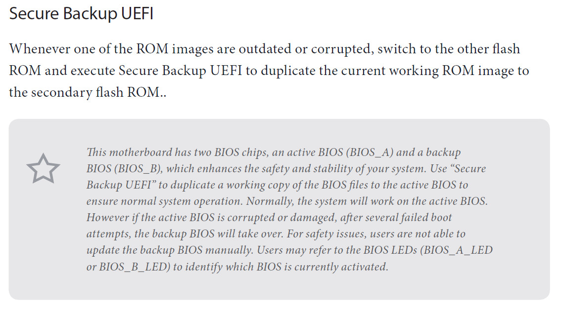 b) Gibt es genauere Angaben zum BIOS backup. Handbuch ist sehr dünn. BIOS B (das "backup") soll irgendwie automatisch aktiviert werden, wenn BIOS A (das "aktive") lange genug nicht funktioniert. Worauf man dann die Möglichkeit erhält, wieder ins BIOS (eben B) zu kommen, und das auf A rüber zu restoren. Ist das alles? Hat man keinerlei eigene Handlungsmöglichkeiten?