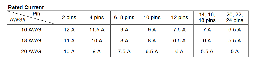 Hier sind lediglich 5,0A pro Paar bei 2 bis 24 Verbindungen und lediglich Kabel von 20 bis 30 AWG zulässig. An anderer