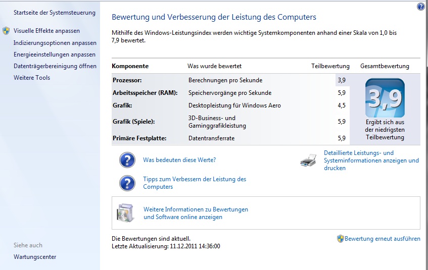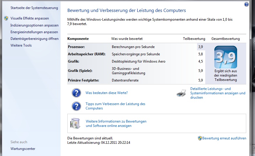 deine Werte können nicht stimmen, mein 1215B mit E-450 und 2GB Speicher bekommt bessere Werte. Habe sämtliche Treiber von der mitgelieferten DVD installiert und hatte das Gerät am Netz betrieben. Laut einigen Infos auf Amazon haben die schlechten werte etwas mit den Energiesparmodi zu tun und das neuere Treiber als die auf der DVD Probleme machen sollen.
