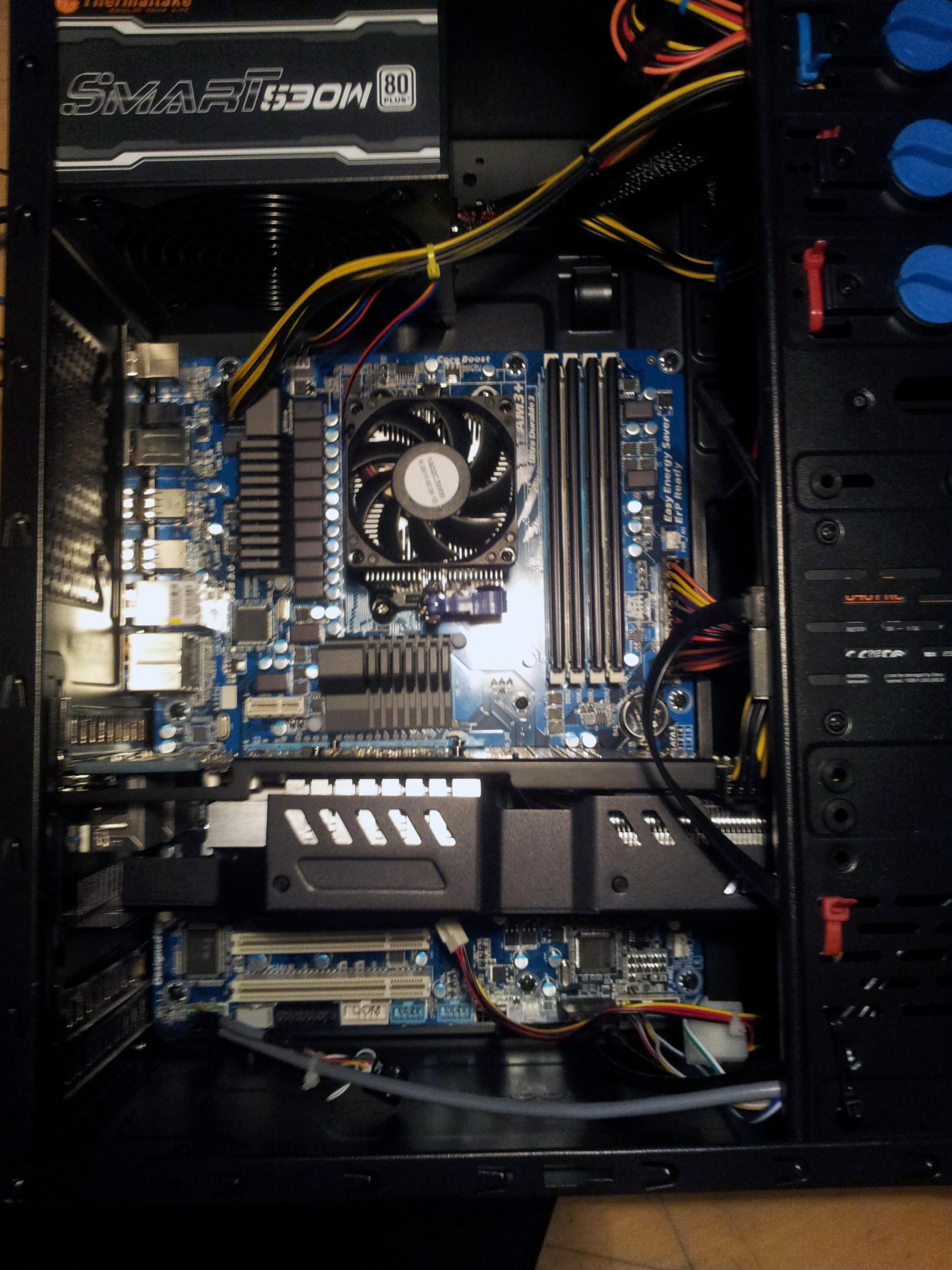 weil die Karte auch durch die Biegung bedingt relativ stark nach unten hängt habe ich sie mir Kabelbindern fixiert. Es wirken keine starken Kräfte auf die Karte oder so nur ganz wenig Zug.