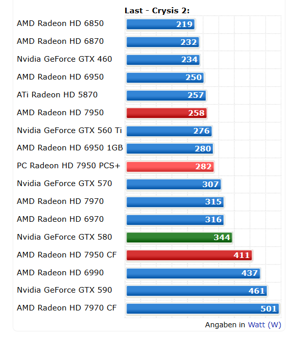 Laut CB verbraucht ein System mit einer Standard 7950 unter Last 255W und mit einer Standard 7970 316W.