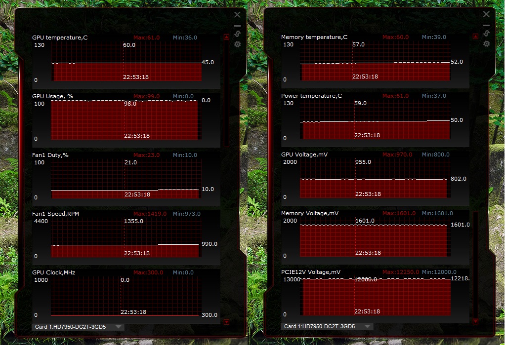 In Idle besitzt die Karte eine Spannung von 0.8V und unter Last mit oben genannter Taktung um die 0.96V (max. 0.97V)