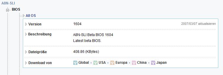 Hab grad mal wieder auf der HP von Asus gestöbert, um zu schauen, ob sich bei den BIOS Dateien für mein Asus A8N-SLI doch noch etwas tut.