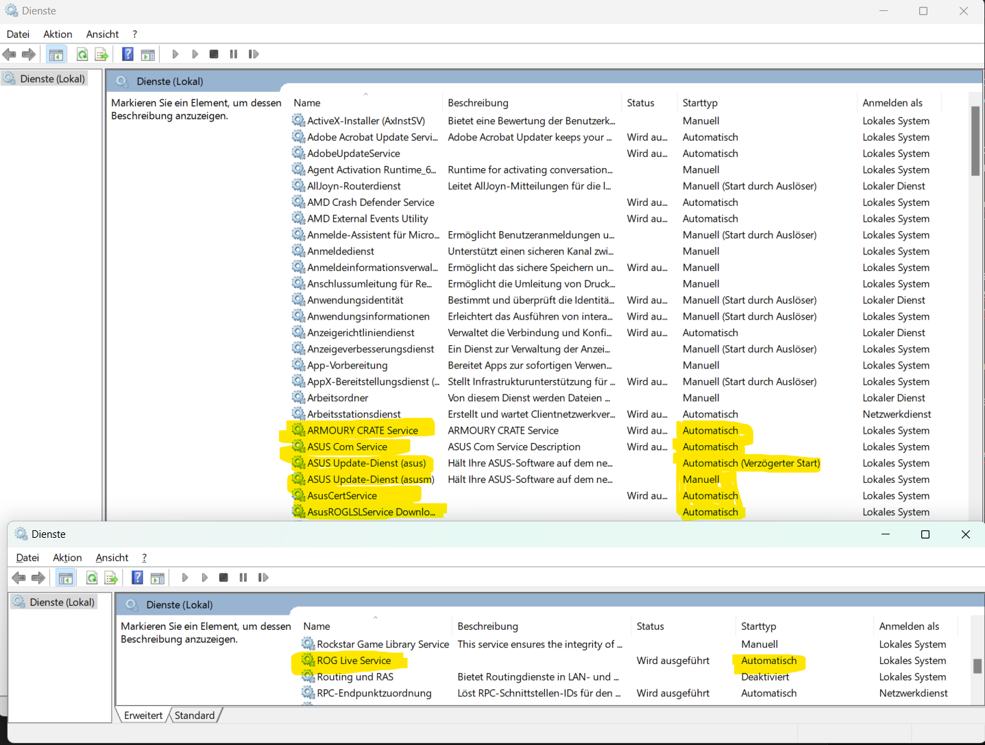 amoury crate: alle Dienste auf manuellen Start gesetzt und alles mit "rog live"deaktiviert. danach dann die roten markierten Programme über Windows deinstalliert, ohne das uninstaller-Tool!