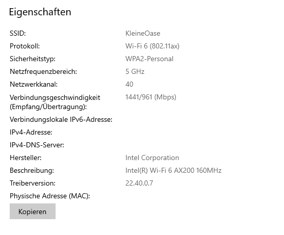 Das ist mein Desktop-PC. Gerade wird über 5 GHz kommuniziert, wobei es in diesem Frequenzband häufiger zu kurzen Latenzsprüngen kommt (mit 2,4 Ghz habe ich die Sprünge nicht). Das wird aber nicht die Verschlüsselung beinflussen.