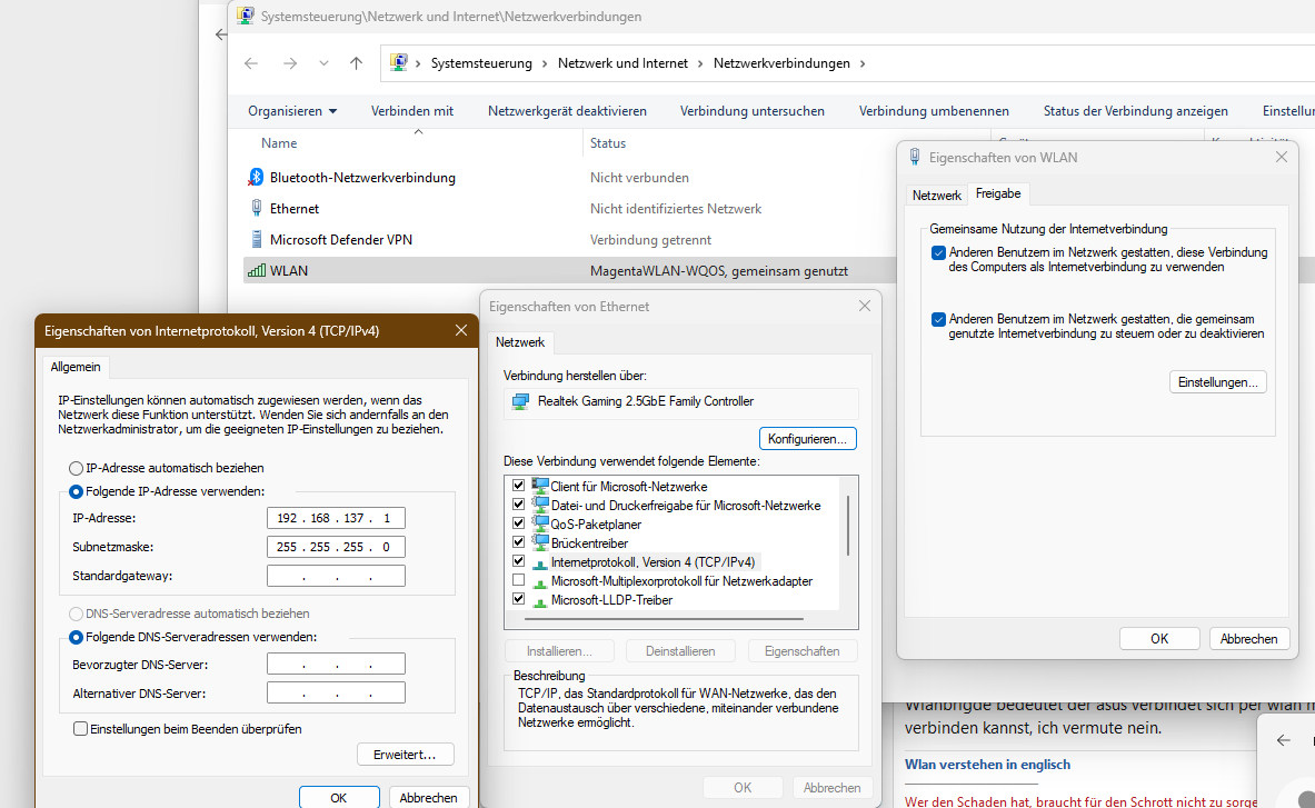 Ich nehme nun den Asus vom Speedport weg und schließe Ihn an meinen Rechner an welcher wieder Internet über WLAN des Speedports bekommt.
