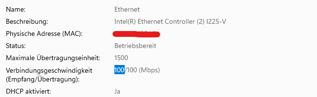 Hab ein Windows 10 mit Asus Rog Strix b550-a Gaming mit Intel I-1225V, welches an einer FritzBox 6490 (1GBit) angeschlossen ist. Die Geschwindigkeit ist leider auf 100Mbit gedrosselt. Ich hab schon ein anderes Kabel versucht (Cat5e), und verschiedene Treiber installiert. Ich habe auch schon die Geschwindigkeit im Treiber versucht manuell auf 1GBit oder 2,5GBit umzuschalten, aber es bleibt bei 100Mbit.