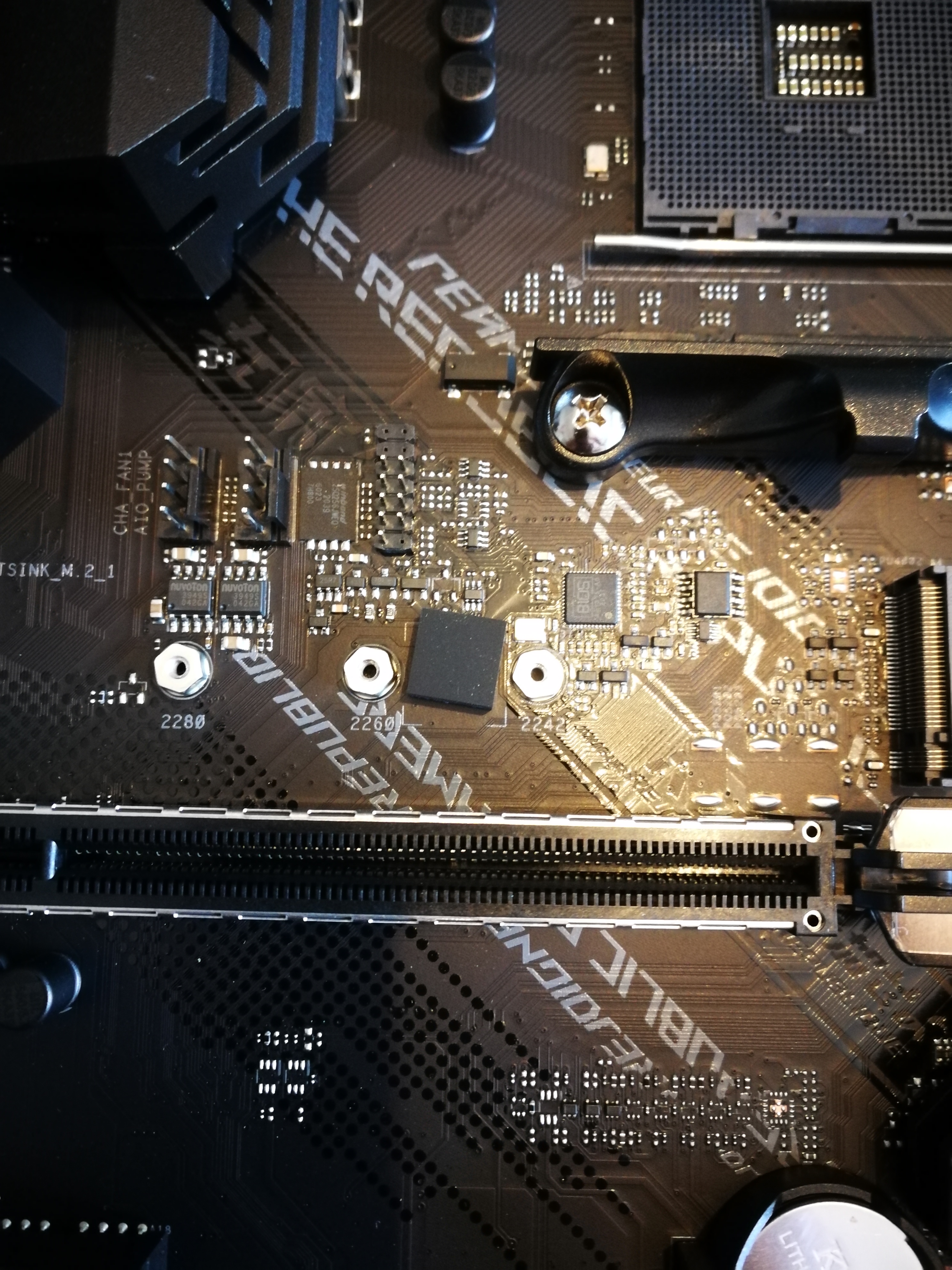 heute habe ich mein niegelnagel neues Board, ein Asus B550 Gaming F Wifi erhalten. Doch die Freude wehrte nicht lang. Als ich meine M.2 einbauen wollte viel mir auf, dass ein schwarzes Viereck - keine Ahnung für was das Bauteil gut ist - verdreht auf der Platine angebracht ist (siehe Bild). Es befindet sich zwischen den Abstandhaltern /Schraubpostionen und ragt ziemlich weit in die Kontakte des Boards hinein. Nun befürchte ich, dass das Board defekt ist oder es zu Folgeschäden kommt, wenn ich das Board in Betrieb nehme. Kann mir jemand sagen, ob das Bauteil normal verbaut ist?