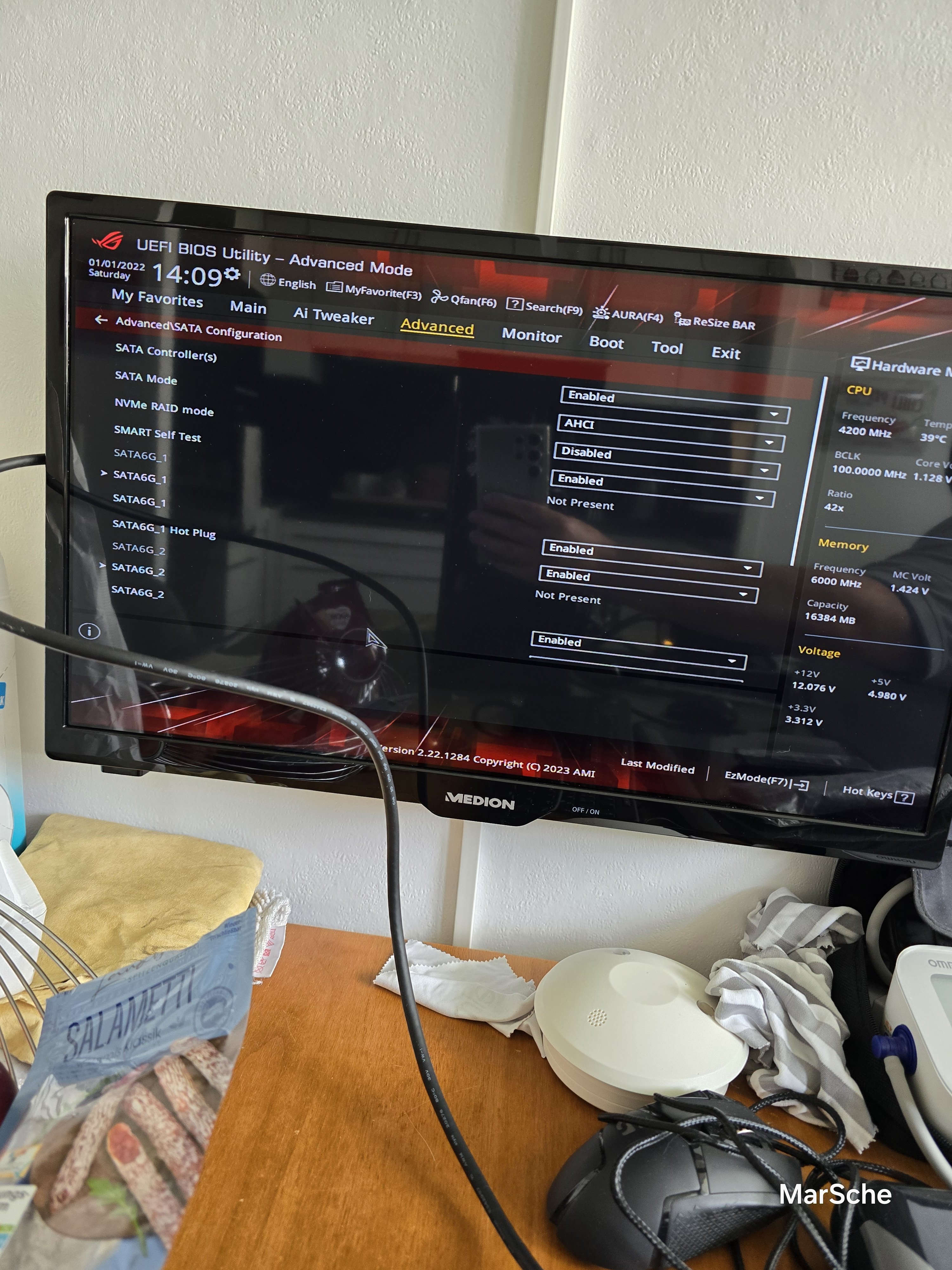 Das Board hat vom Werk die Bios Version 1807 installiert das Board kommt auch ins Bios. Dort sehe ich jedoch keinerlei meiner NVMe Steckplatz 1 oder SSD's die per SATA 1/2/3 angeschlossen sind.