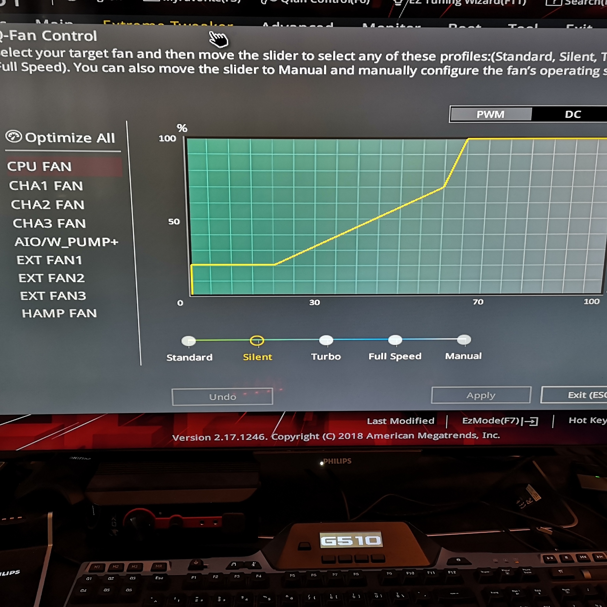 bei mir läuft oben genannte Combo nach Lüfterkalibrierung innerhalb des BIOS im Silent-Modus. Ich habe das Phänomen, dass der PC superleise ist, doch sobald z.B die CPU mal wärmer wird (Game) dreht der CPU läufter so circa 3 Sekunden auf volle Power(es lebe der Trockenfön) was mir jedesmal einen Schock versetzt.