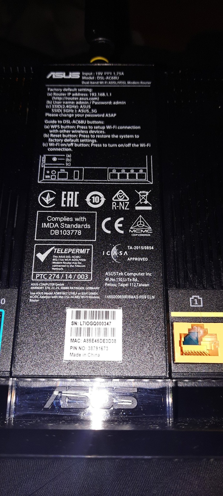 Wenn ich mir auf der Seite von Asus den DSL-AC68U angucke und mir u.a. das das Bild ansehe, fällt mir kein Unterschied zu den LAN Ports auf, was den Stecker betrifft.