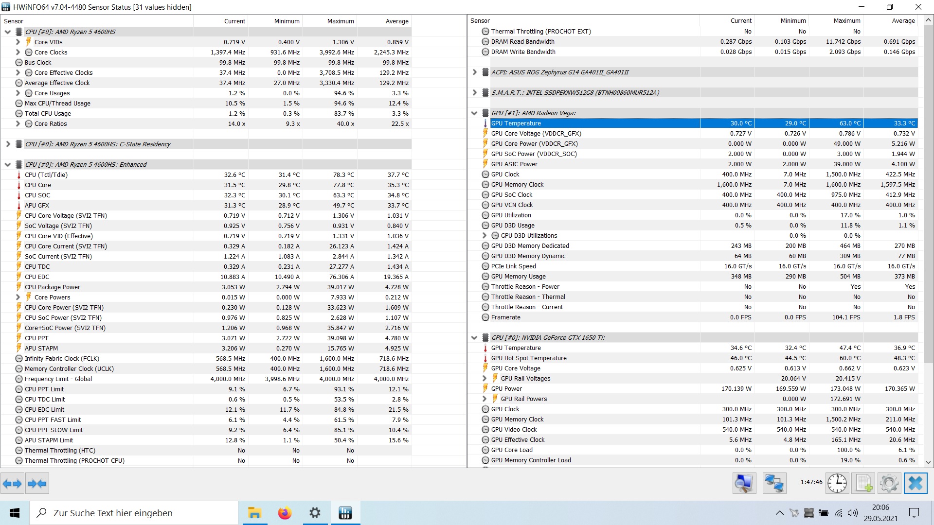 Der VRAM taktet auf 6000 MHz, die Auslastung ist bei ~100% und es bewegt sich nichts, die ganze Zeit 300 MHz. Die Temperaturen sind mehr als im grünen Bereich bei ~50-60° C, manchmal auch weniger (für GPU und Hotspot). Es ist auch das große Netzteil mit Rundstecker angeschlossen, also nicht dass USB-C mit weniger Leistung.