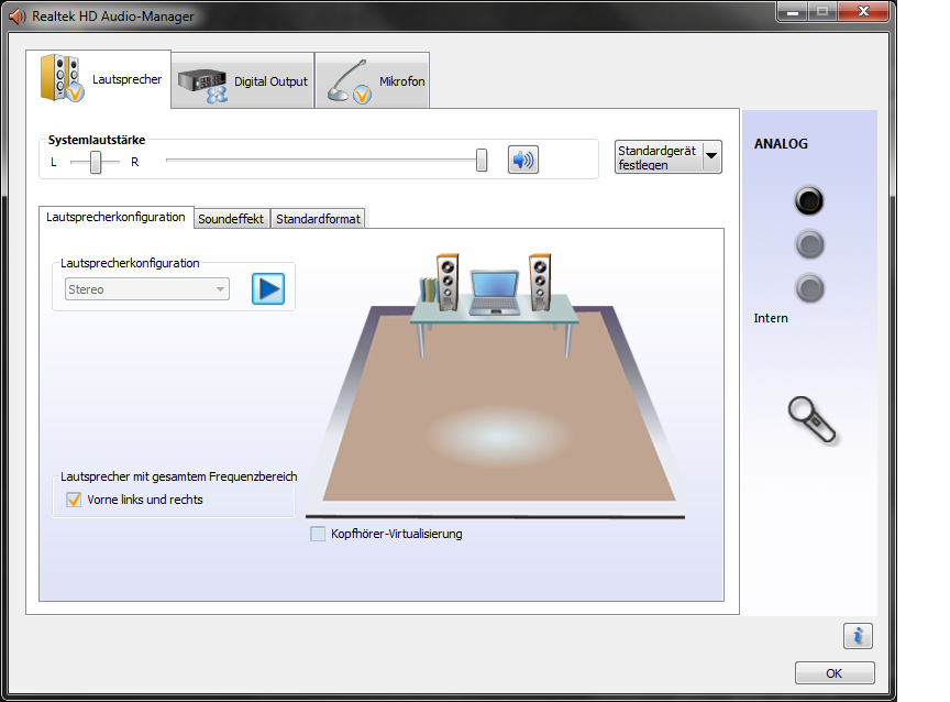 Dann habe ich nochmal bei Win7 im Realtek hd audio manager geschaut und er erkennt angeblich einen eingesteckten Kopfhörer obwohl keine Kopfhörer angeschlossen sind???