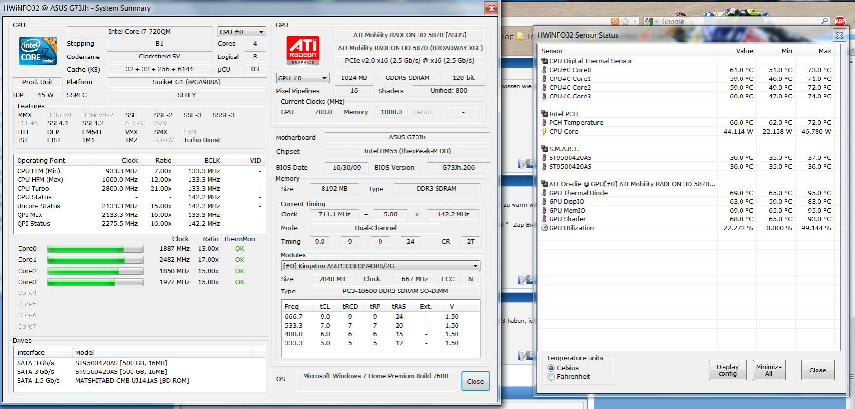 ich habe ein ASUS G73JH-TZ014V mit einem Core i7-720QM 4x 1.60GHz und einer ATI Mobility Radeon HD 5870 1024MB. Wenn ich spiele stürzt nach ca 10 Minuten das gesamte System ab. Ich habe schon 3 verschiedene Treiber für ATI probiert. ASUS Treiber, ATI-Treiber 10.3 und 10.4, egal welcher Treiber installiert ist das System stürzt ab. Auflösung 1920x1080. Wer hat auch ein G73 und ähnliche Probleme? Habe dem ASUS Support eine Meldung geschrieben, habe aber noch keine Antwort.