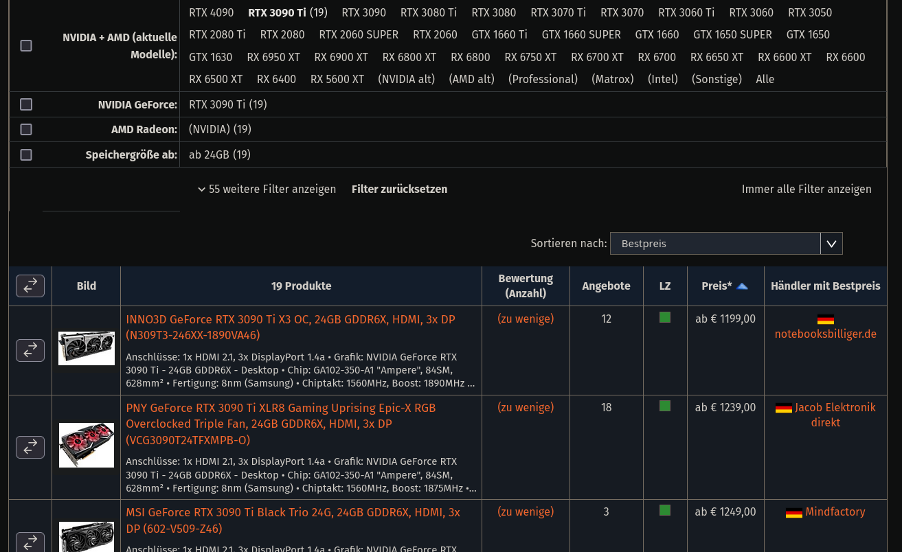 Mein Tipp: Warten. Diese Wucherpreise werden nicht langanhaltend sein, ist nur der 1. Panikrun ausgelöst von jenen Leuten, die noch nicht überrissen haben, dass die Situation gegenüber 3000er Serie eine völlig andere ist. Und natürlich ist das neue Mega-Super-Duper-Flagship sowieso immer überteuert